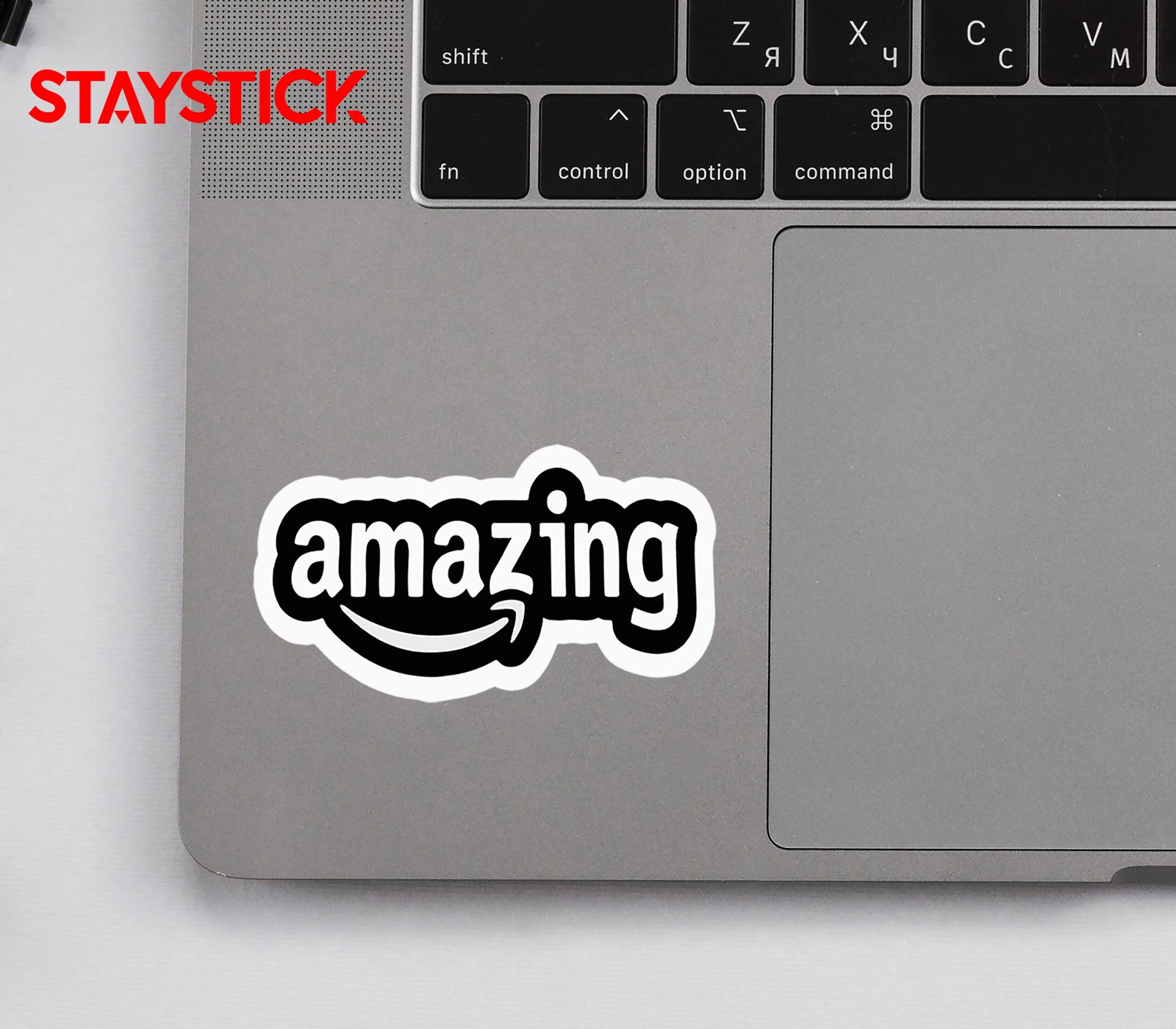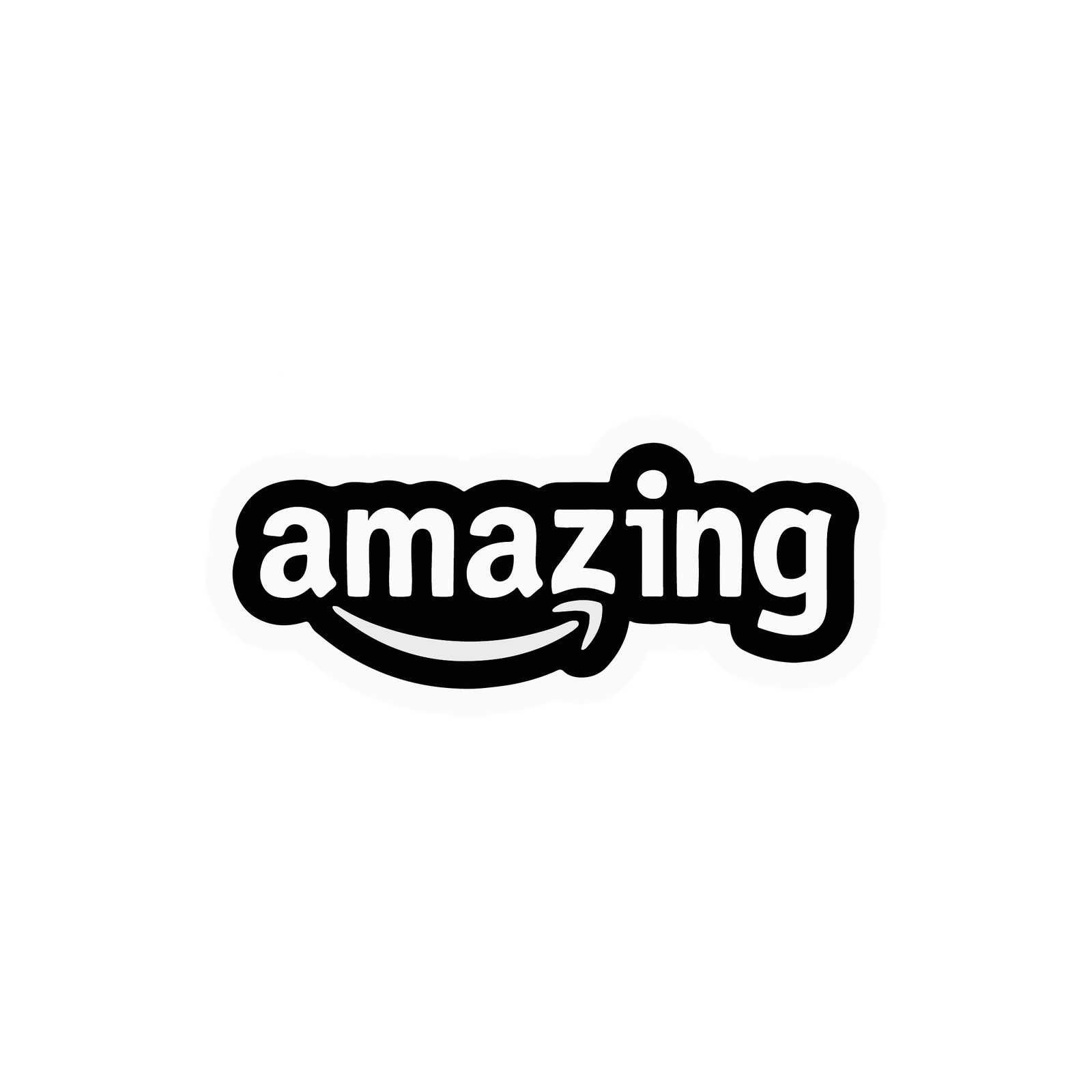 “This sticker features the word ‘amazing’ in a bold, rounded white font set against a solid black background, outlined with a thick white border that makes it pop. Below the text, there’s a curved arrow forming a subtle smile, adding a fun and positive vibe to the design. The clean, modern look combined with the playful curve gives the sticker an eye-catching and uplifting appearance, making it perfect for laptops, bottles, notebooks, or any surface where you want to spread positivity and highlight something truly amazing.”