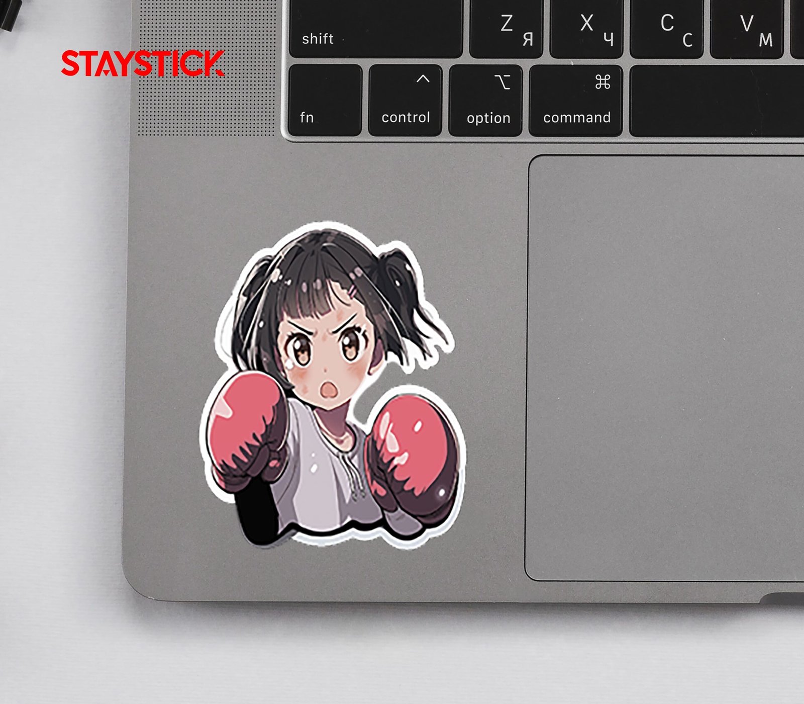 Iridescent chibi girl throwing a punch, glossy pink gloves and intense eyes—perfect for laptops, water bottles, or merch.
