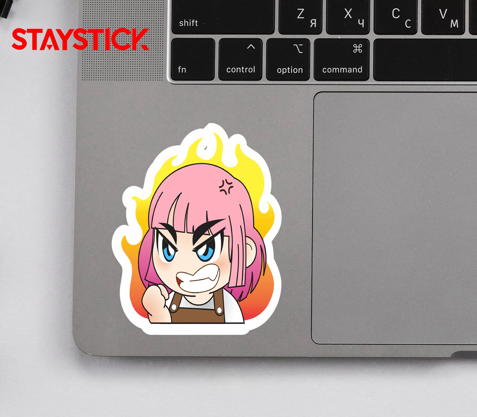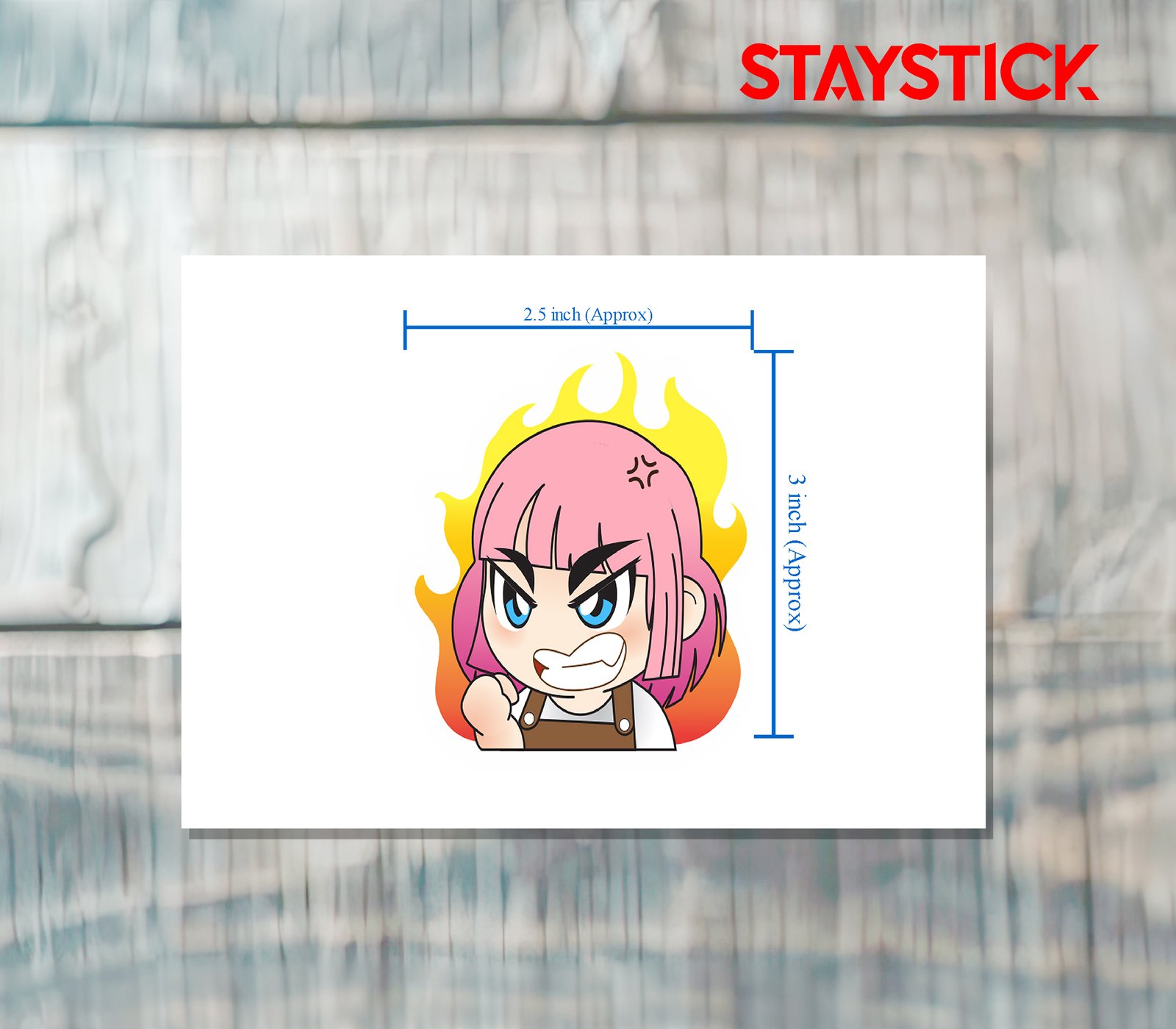 This vibrant sticker features a fierce and fiery character with striking pink hair, piercing blue eyes, and an expression full of determination and anger. The clenched fist, furrowed brows, and the blazing flames in the background add a dramatic touch, symbolizing unstoppable energy, frustration, or the readiness to fight back. Perfect for showcasing strong emotions, this sticker captures the intensity of passion, courage, and resilience in a playful cartoon style. Whether you want to express annoyance, stand your ground, or simply add a bold touch to your collection, this sticker delivers a powerful message with fun and flair.