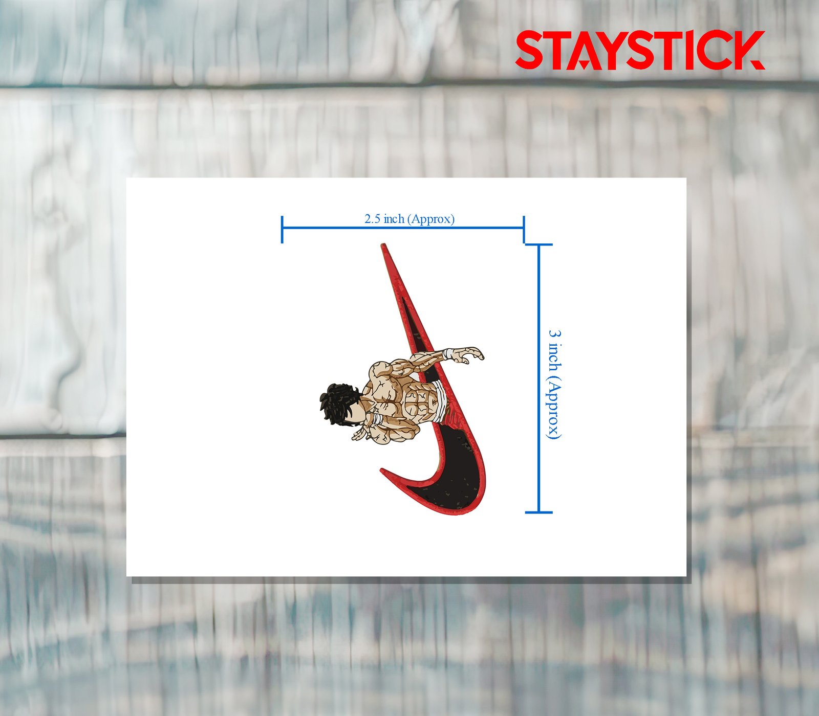 This sticker features a confident, muscular anime-style character striking a cool pose, emphasizing strength, attitude, and charisma, with a bold swoosh-like design in the background that adds energy and flair.