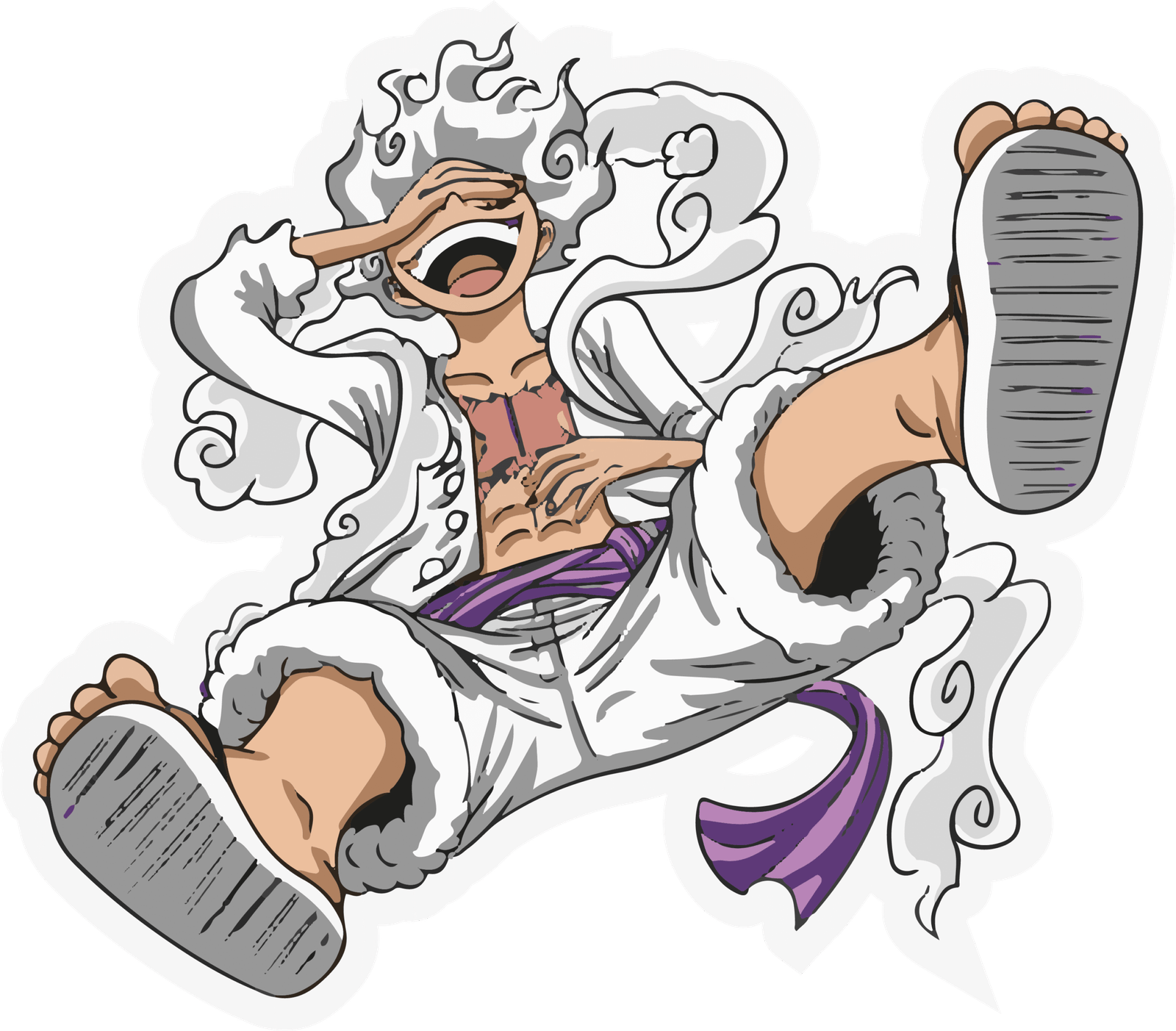 “This vibrant sticker features a lively anime character bursting with joy, captured in a carefree and playful pose. With a wide, hearty laugh, the character radiates energy and happiness, while surrounded by swirling, cloud-like wisps that give a sense of motion and power. Dressed in loose white clothing with a purple sash, the design highlights both strength and freedom. Perfect for fans of anime, this sticker brings a bold mix of fun, energy, and dynamic expression, making it an eye-catching addition to any collection, laptop, or journal.”