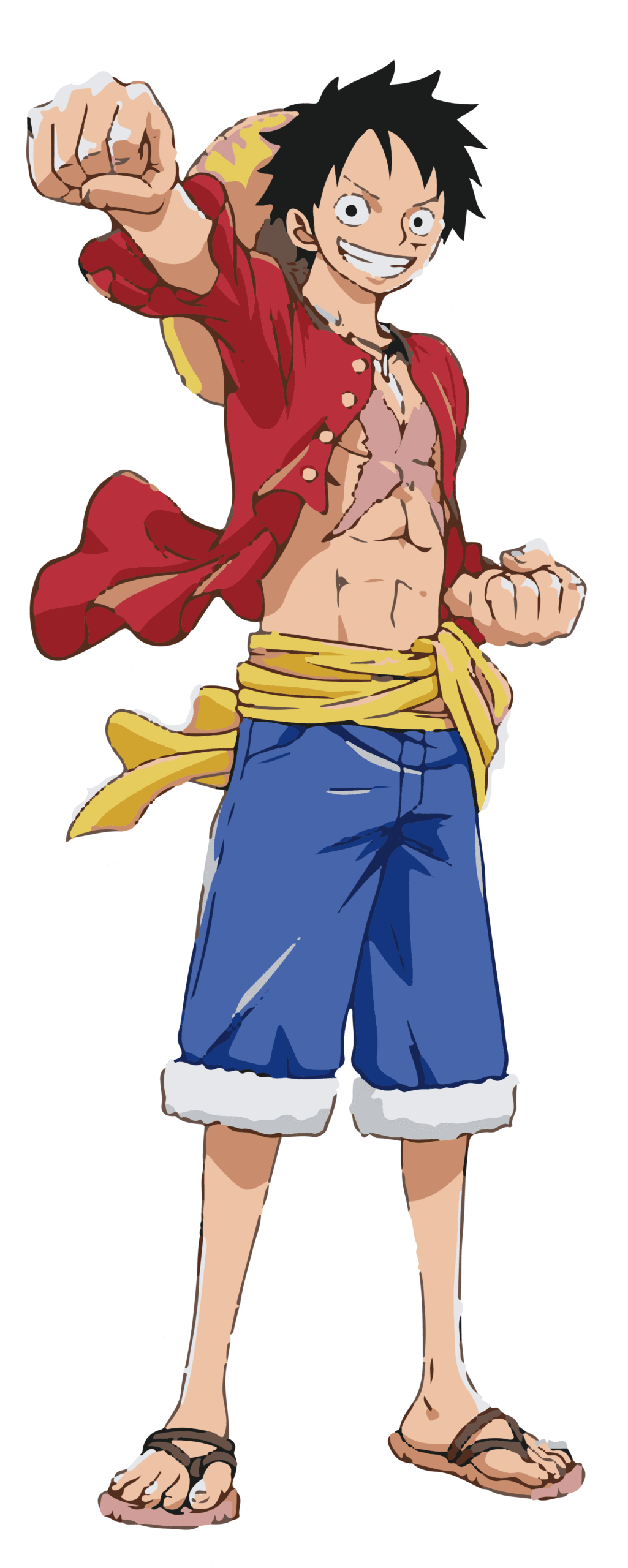 “This sticker features an adventurous anime hero radiating energy, determination, and positivity. With a confident grin across his face, he raises his fist high in the air, symbolizing his fearless spirit and readiness to take on any challenge. His casual yet iconic outfit—a red open jacket, blue shorts with rolled-up edges, a bright yellow sash tied around his waist, and sandals—perfectly reflects his free-spirited personality. The bold scar across his chest tells a story of past battles and resilience, while his lively stance captures his unshakable optimism. This sticker is a perfect representation of courage, adventure, and the never-give-up attitude that defines a true hero.”