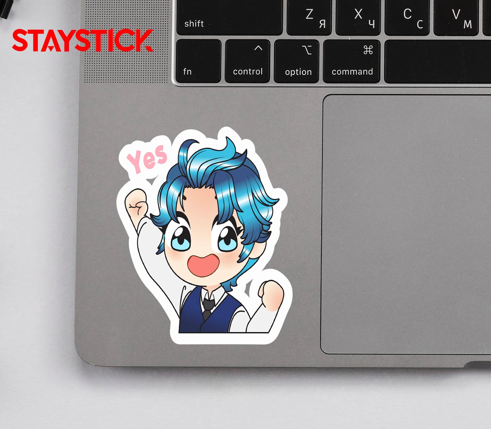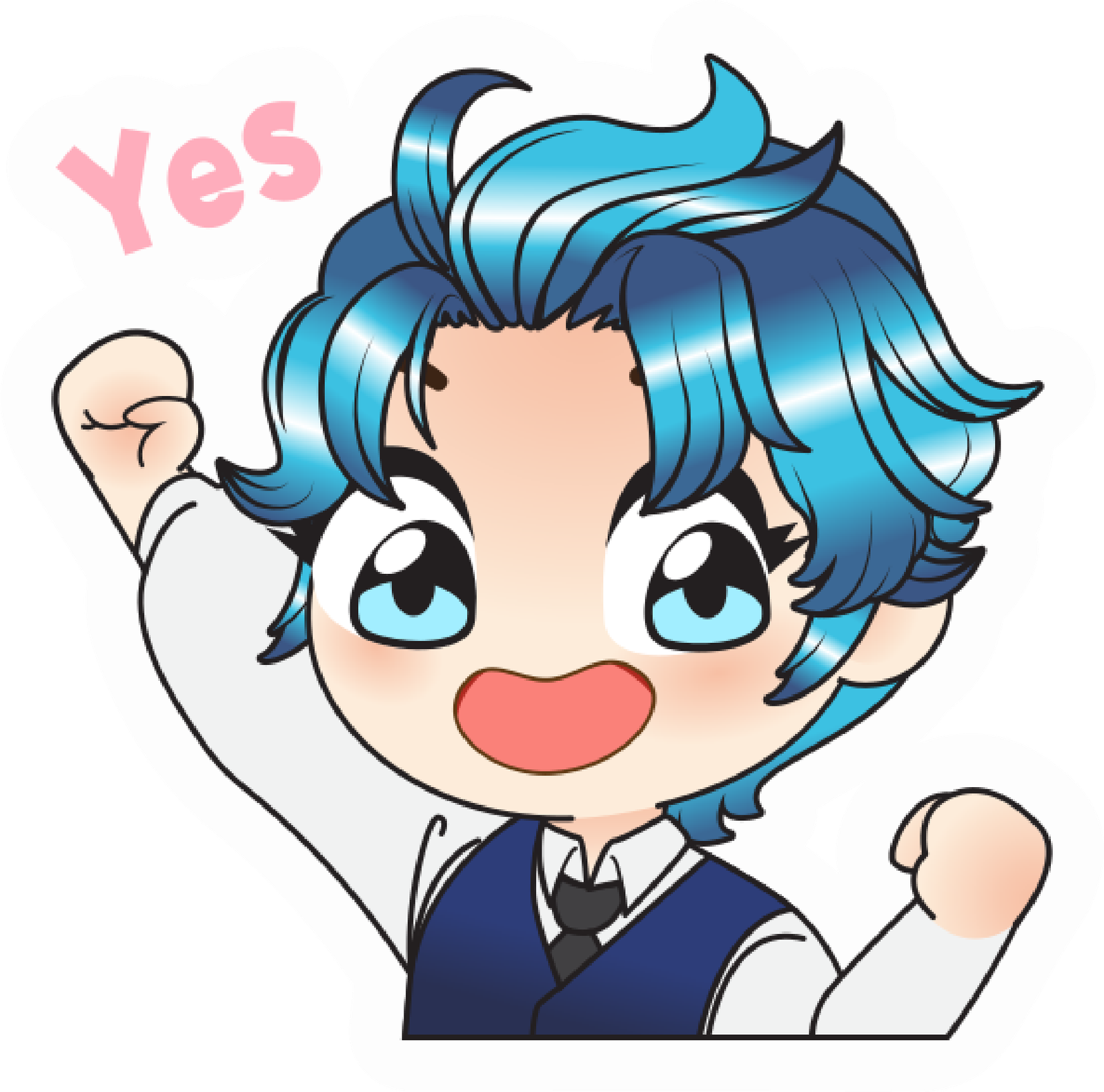 This amazing anime sticker features a lively character with striking blue hair, bright eyes, and an expression full of excitement and joy. With both fists raised high in a victorious pose and a wide, enthusiastic smile, the character radiates positivity and motivation. The word “Yes” above them adds extra energy, making the sticker perfect for moments of success, encouragement, or celebration. Dressed neatly in a vest and tie, the character combines charm with determination, making this design ideal for expressing triumph, happiness, or cheer in any conversation. Whether used to celebrate achievements, motivate friends, or spread good vibes, this sticker captures the true spirit of enthusiasm and victory.