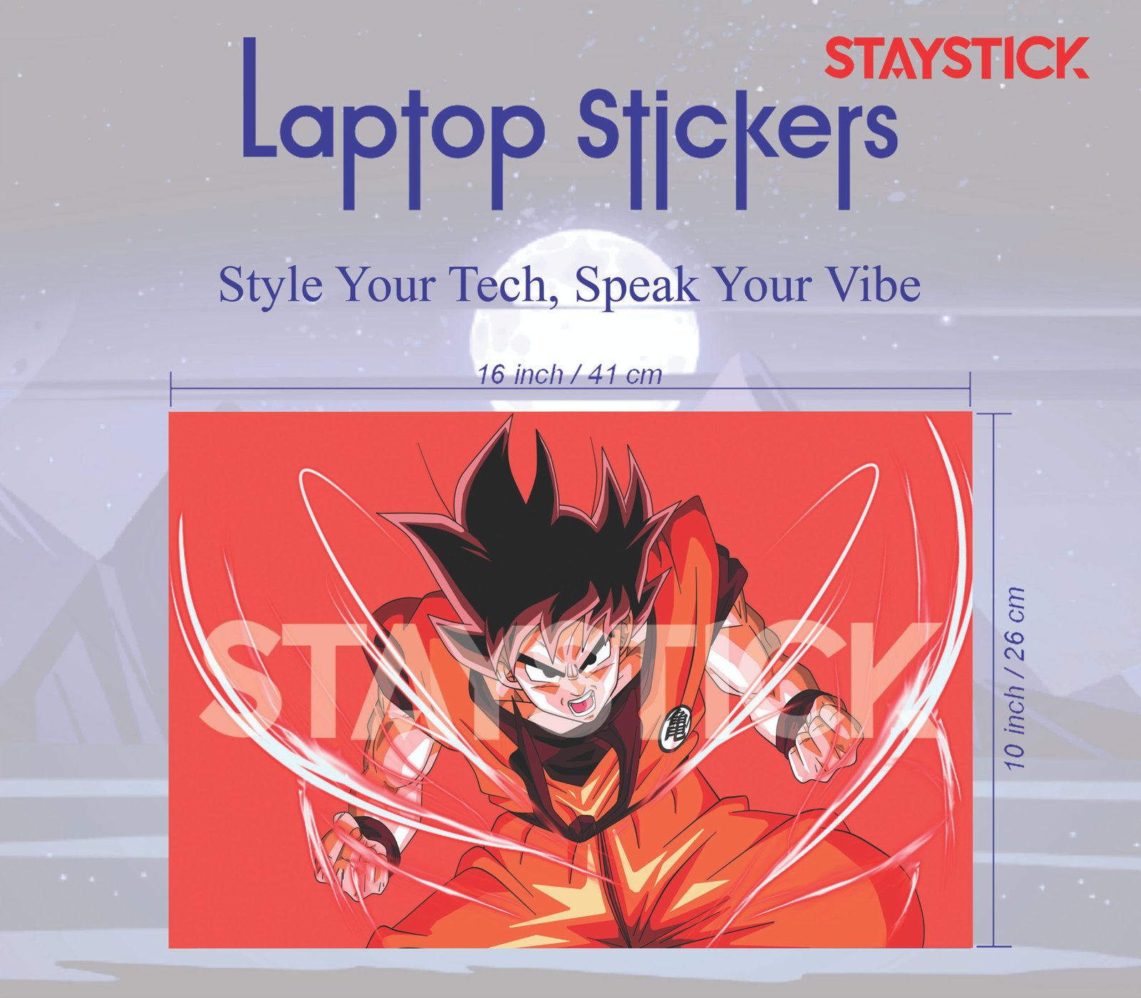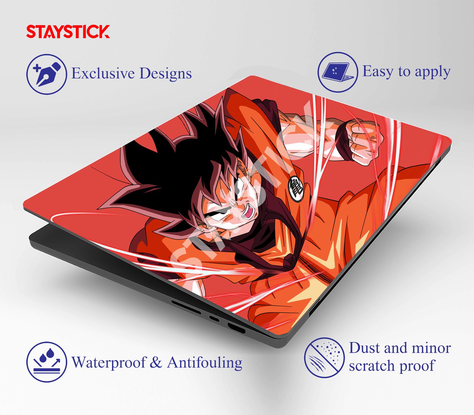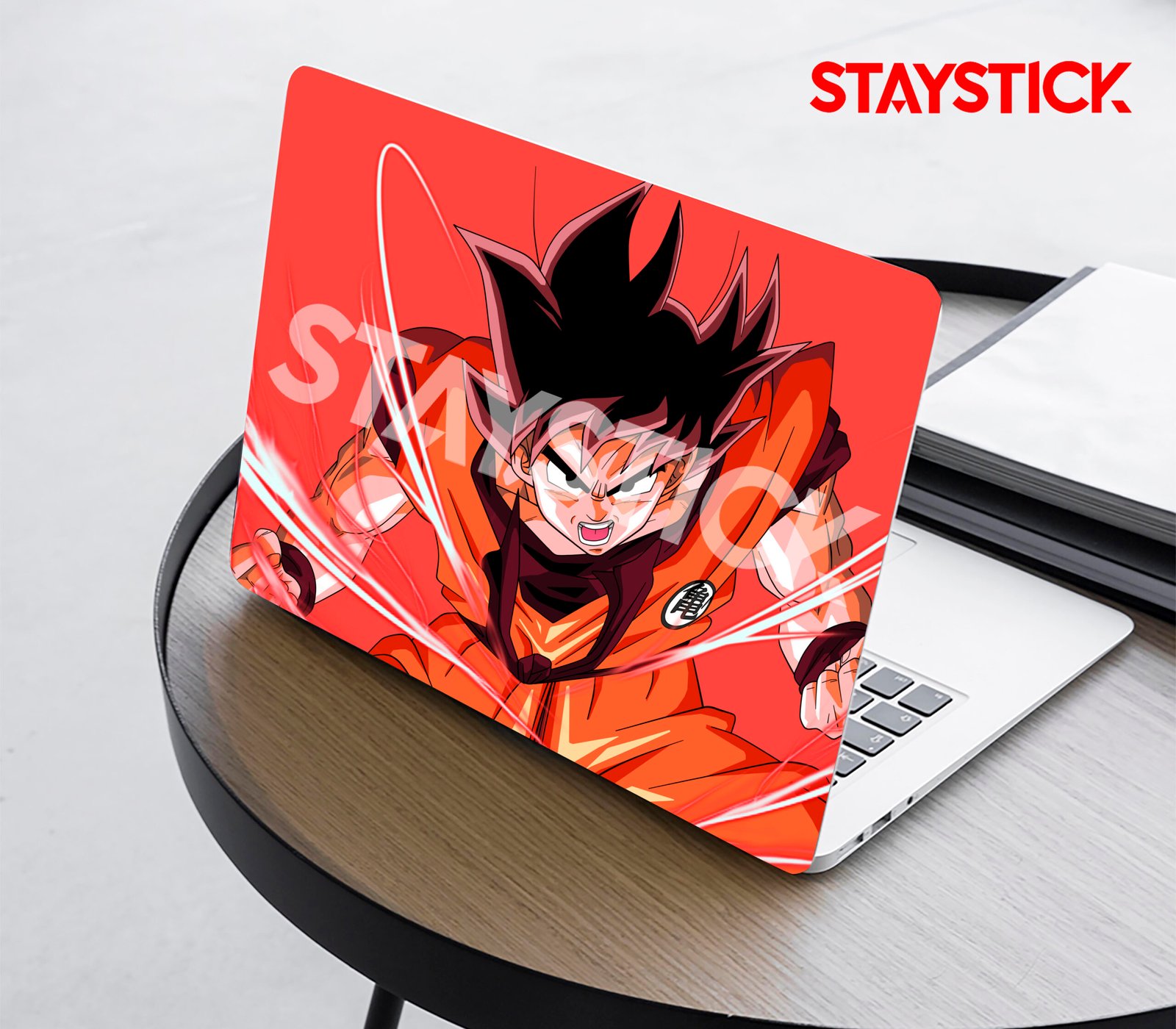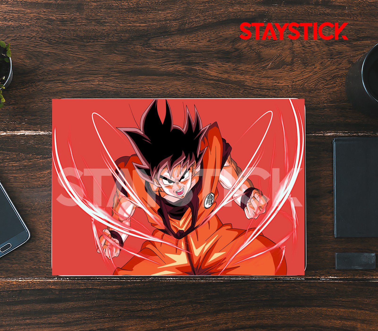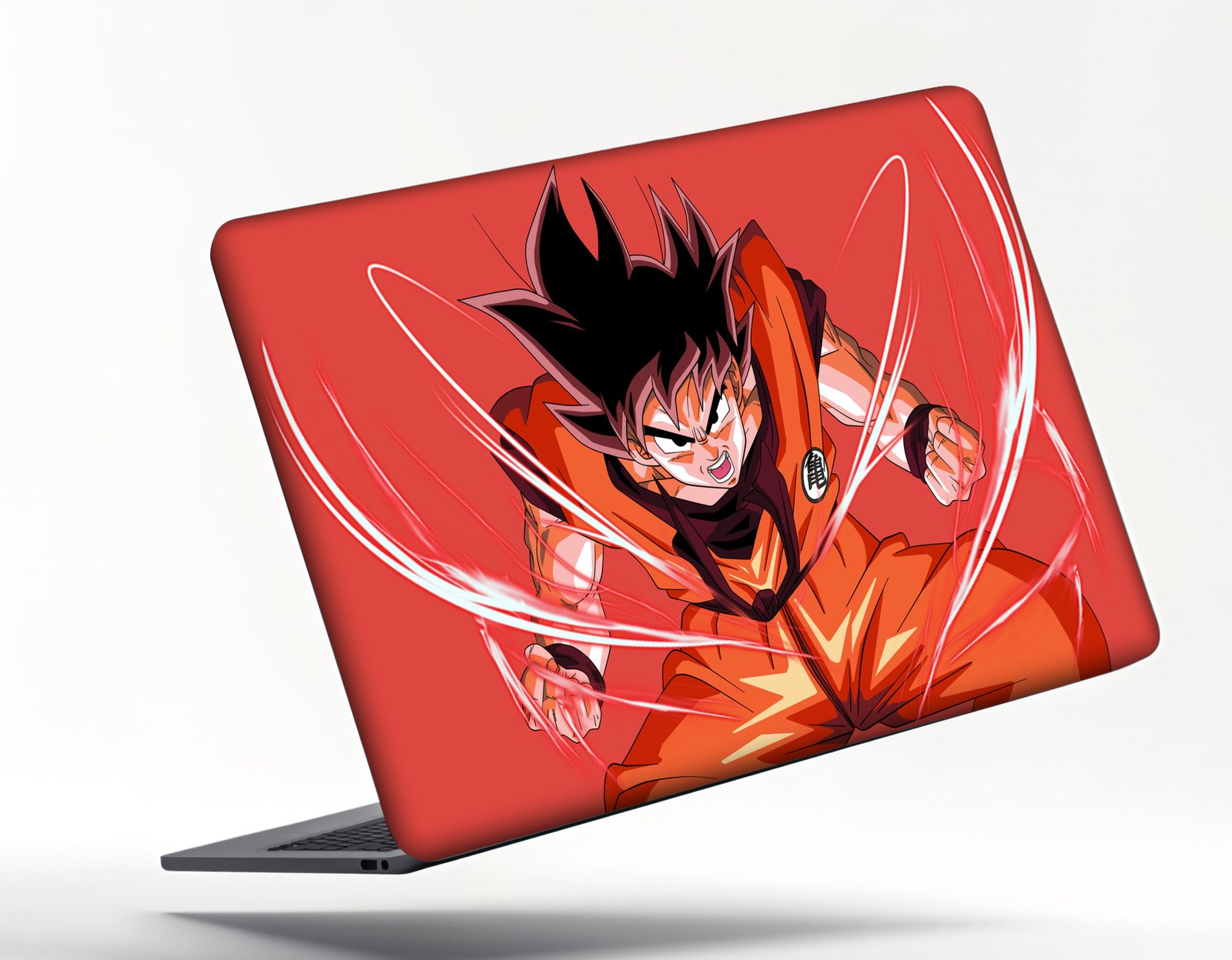 Bold anime laptop sticker featuring Goku in battle mode.
