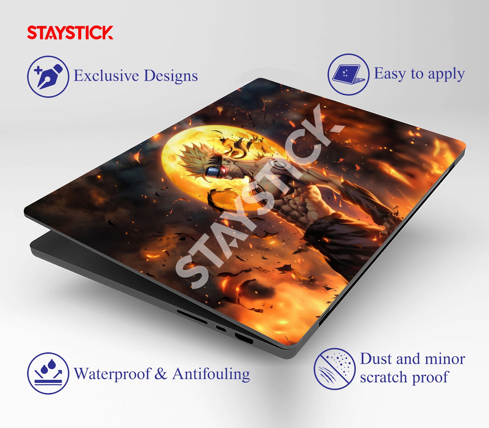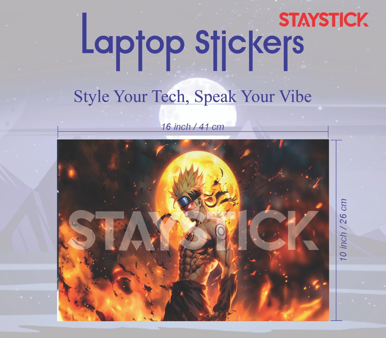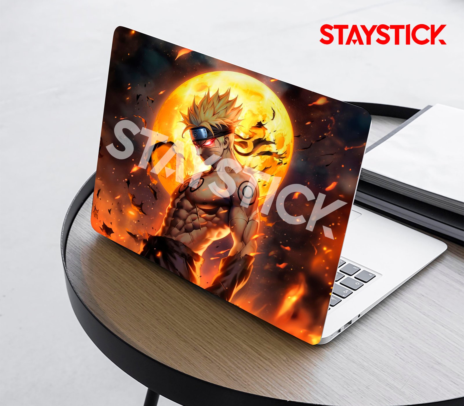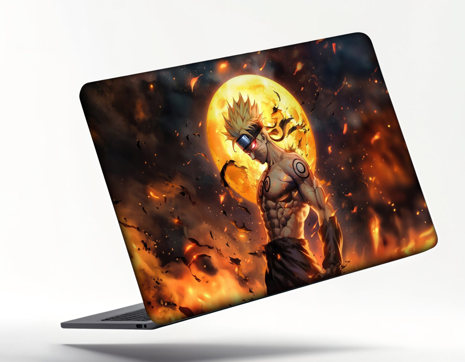 This striking laptop sticker showcases Naruto Uzumaki in a dramatic and powerful pose, set against a fiery and intense backdrop. The bright full moon behind him illuminates the scene, enhancing the dramatic impact as flames swirl around him. With his body covered in chakra markings, his determined expression, and his iconic headband, Naruto exudes an aura of strength and resilience. The vivid colors and dynamic composition emphasize his energy, creating a visually striking and action-filled scene. Perfect for Naruto fans and lovers of powerful, fiery imagery, this sticker captures the spirit of one of the most iconic anime characters.