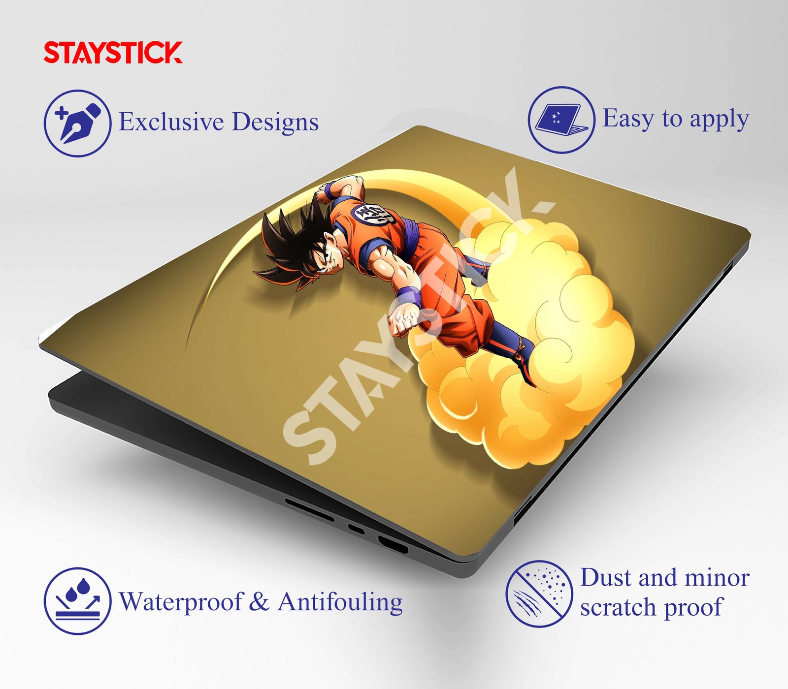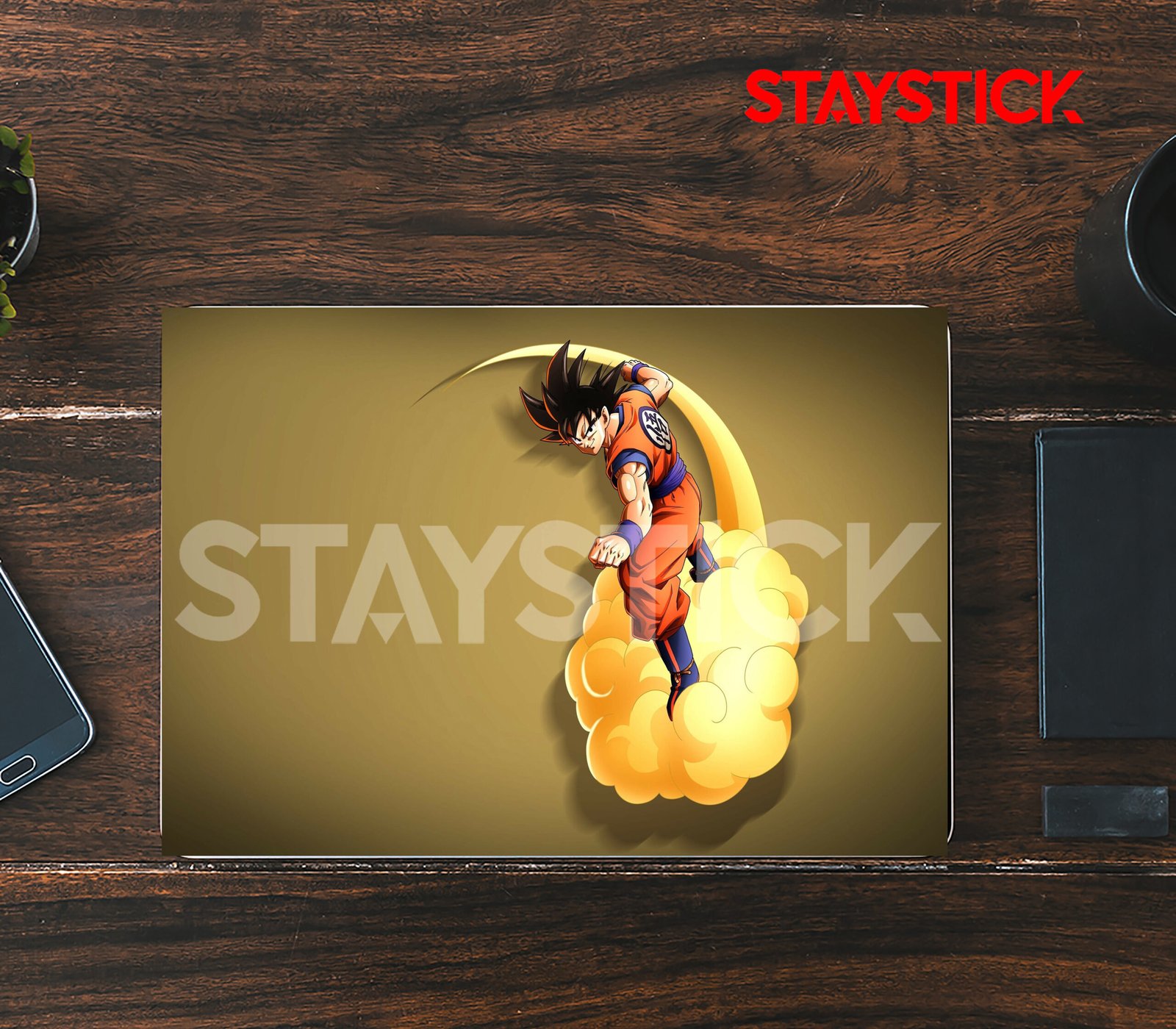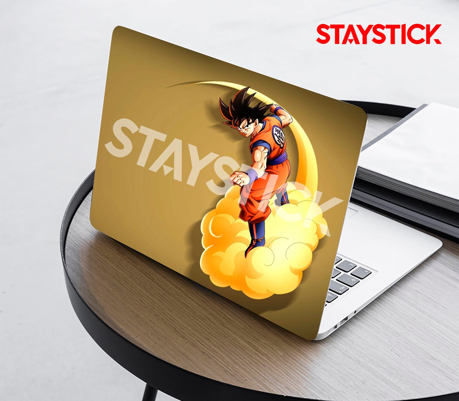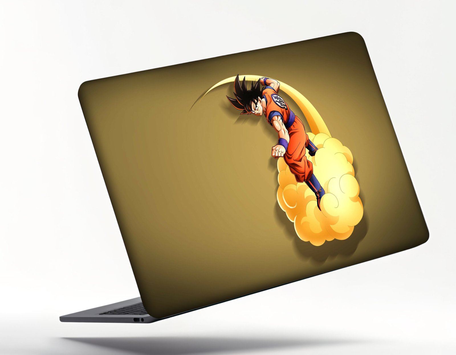 Goku oStylish anime design Sleek Dragon Ball–themed laptop skin with a golden background.