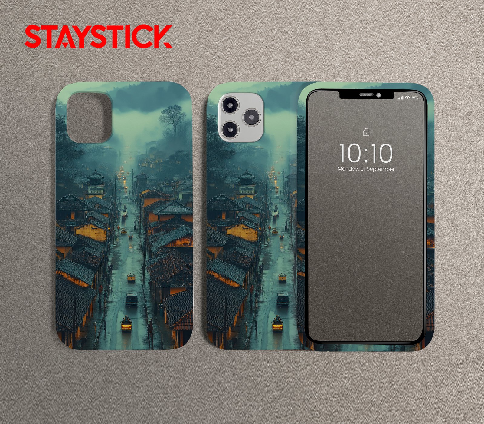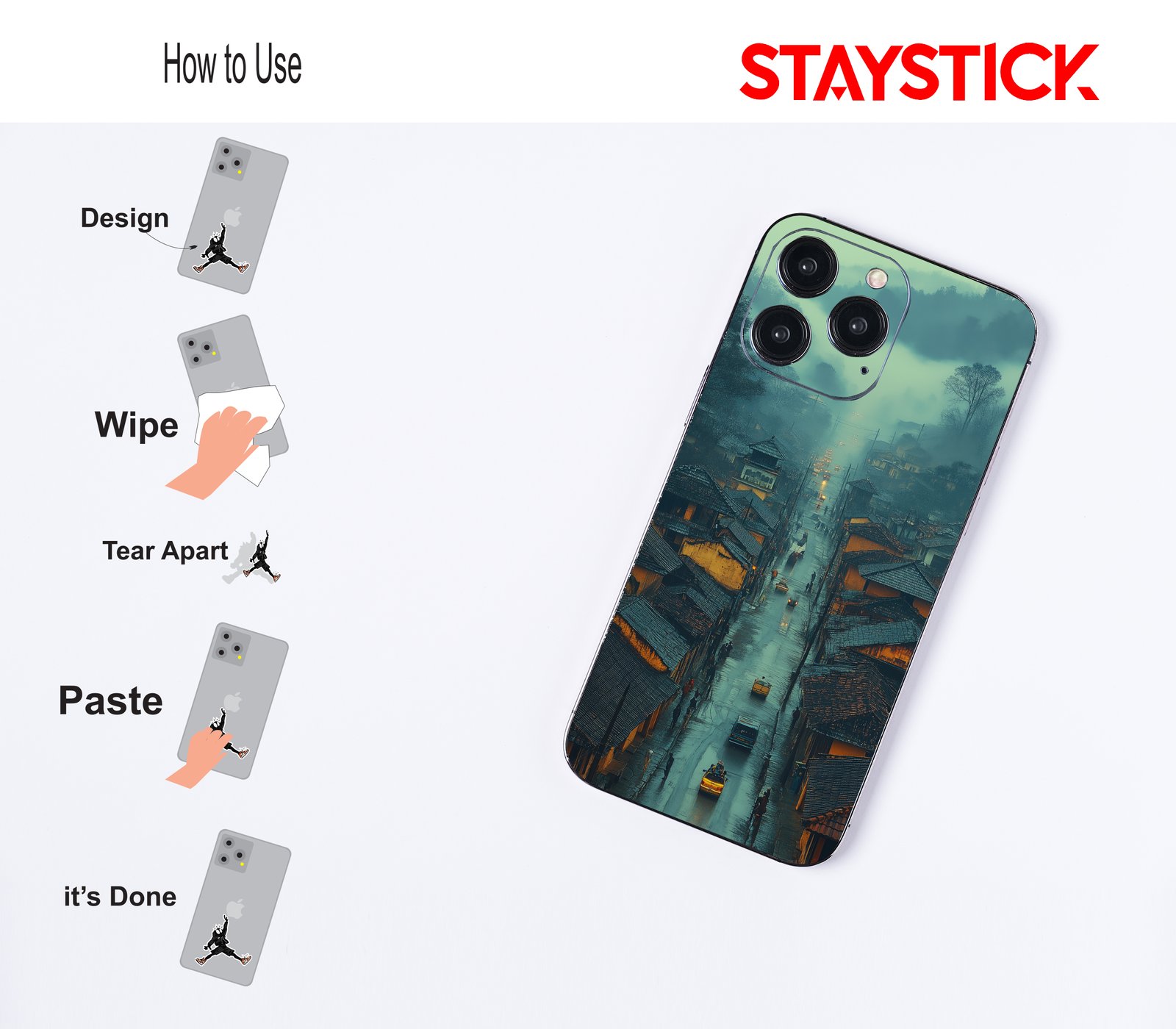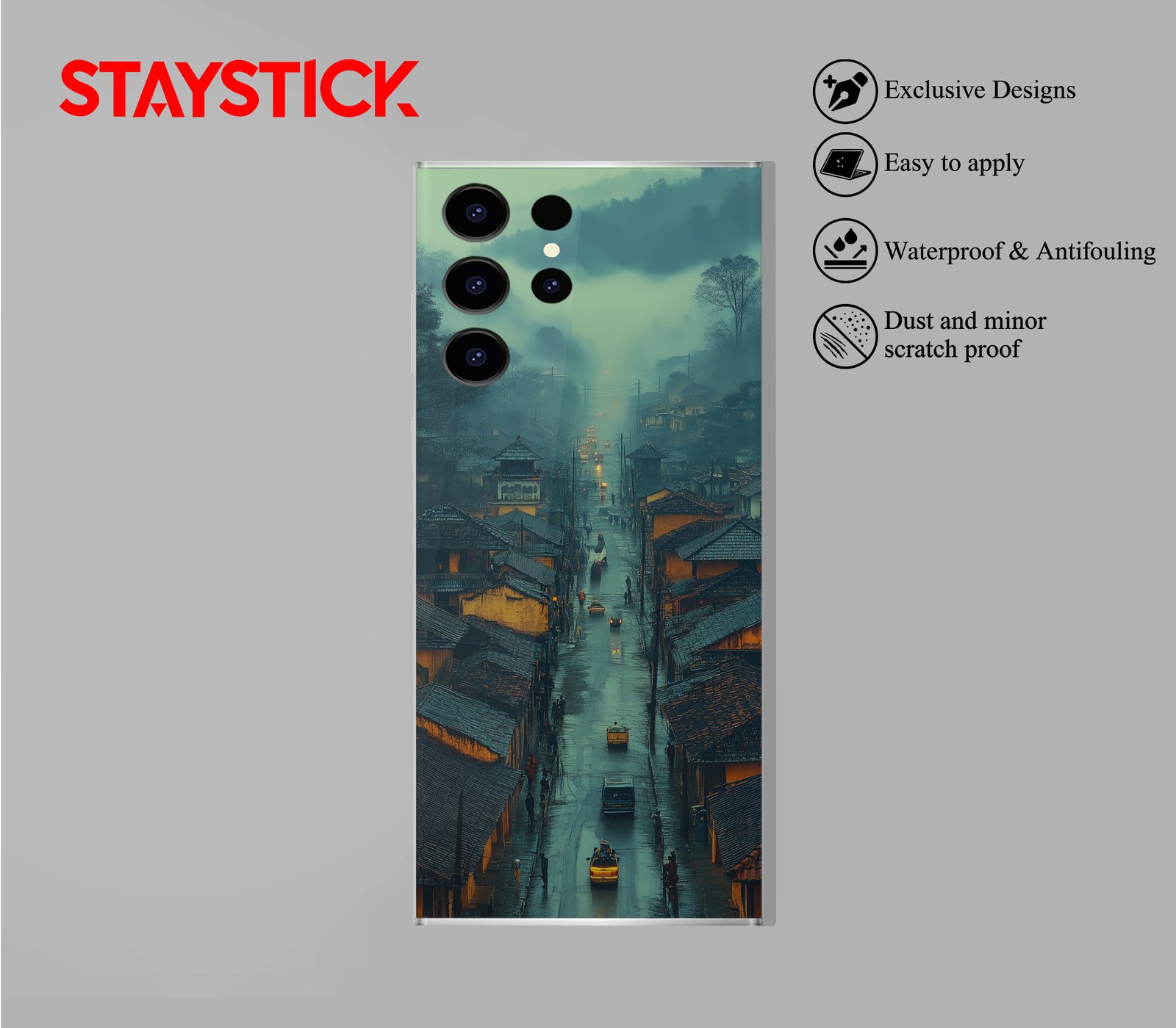 Bring cinematic elegance to your device with this high-quality mobile back skin sticker. The artwork captures a peaceful, rain-kissed street at dusk, where soft fog rolls over quiet rooftops and the glow of streetlights reflects on wet pavement. Inspired by traditional towns set against lush, misty hills, this design radiates calm, nostalgia, and quiet adventure. Printed on premium vinyl, it protects your phone from scratches and smudges while adding a sophisticated touch of art. Easy to apply and residue-free when removed, it’s perfect for anyone who loves moody landscapes, rainy days, and timeless urban beauty.