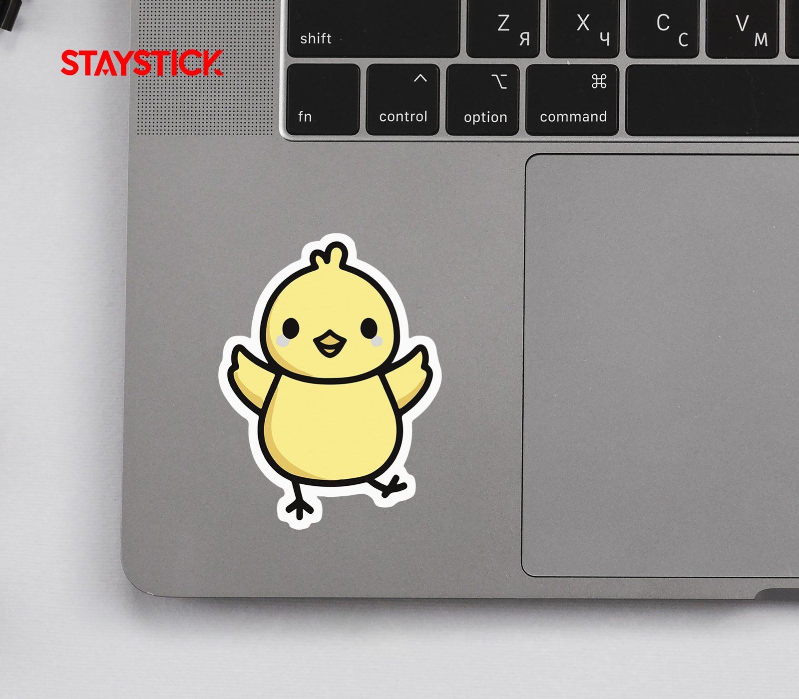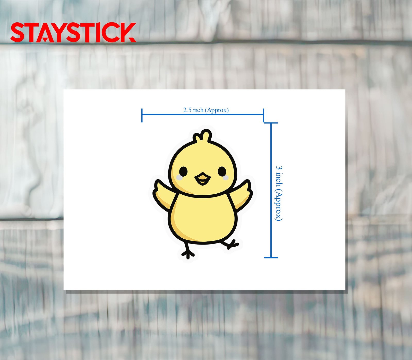 This sticker showcases an adorable yellow chick with a joyful expression, tiny blush marks, and wings spread wide as if ready for a hug or a happy dance. Its round, chubby body and playful pose bring a sense of warmth and positivity, making it perfect for brightening up your phone, laptop, water bottle, or notebook. The bold white outline gives it a crisp, clean look that pops against any background. Ideal for animal lovers, kawaii-style fans, or anyone who enjoys adding a touch of sunshine and happiness to their everyday items.