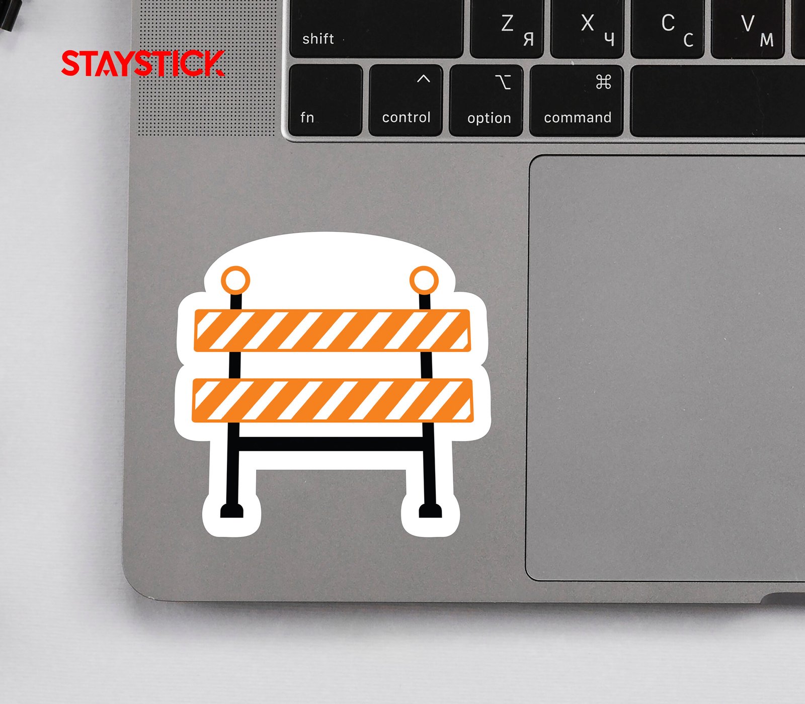 “This sticker shows a construction-style barricade with orange and white diagonal stripes, supported by two black posts with circular markers on top. It is a universal sign for roadblocks, restricted access, or construction zones.The design is often used in workplaces, road safety contexts, or digital media to indicate temporary closures, detours, or restricted entry. Its bold orange stripes ensure visibility and communicate caution, helping to prevent accidents and guide individuals safely around hazards or work zones.”