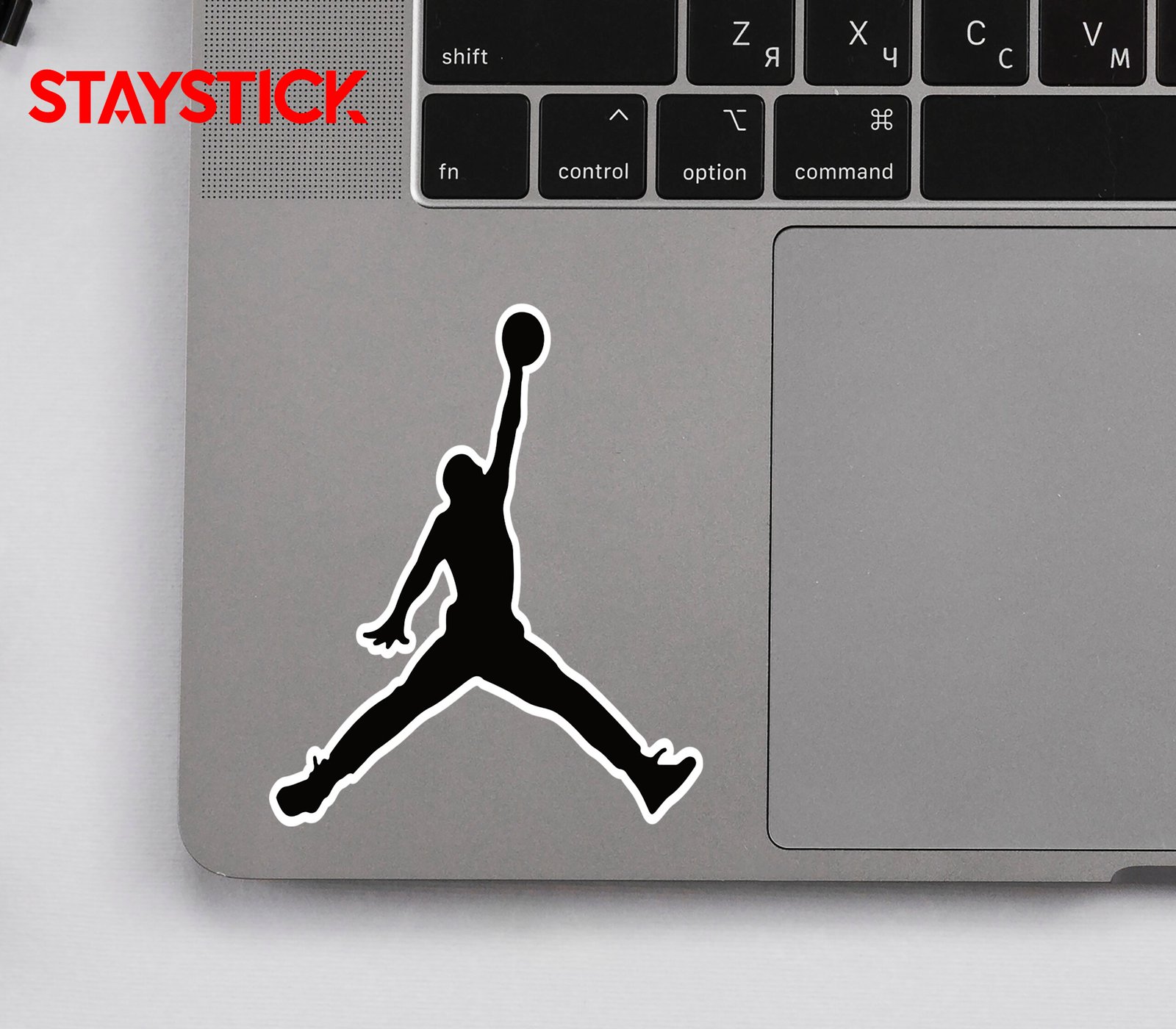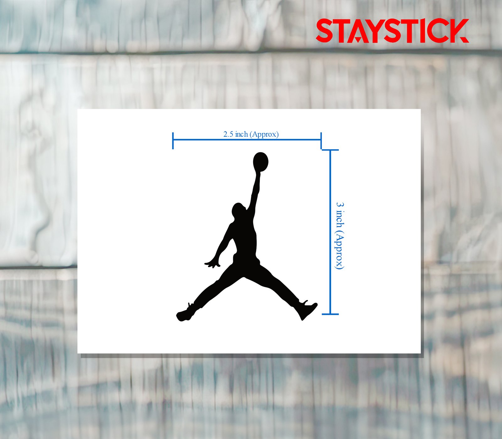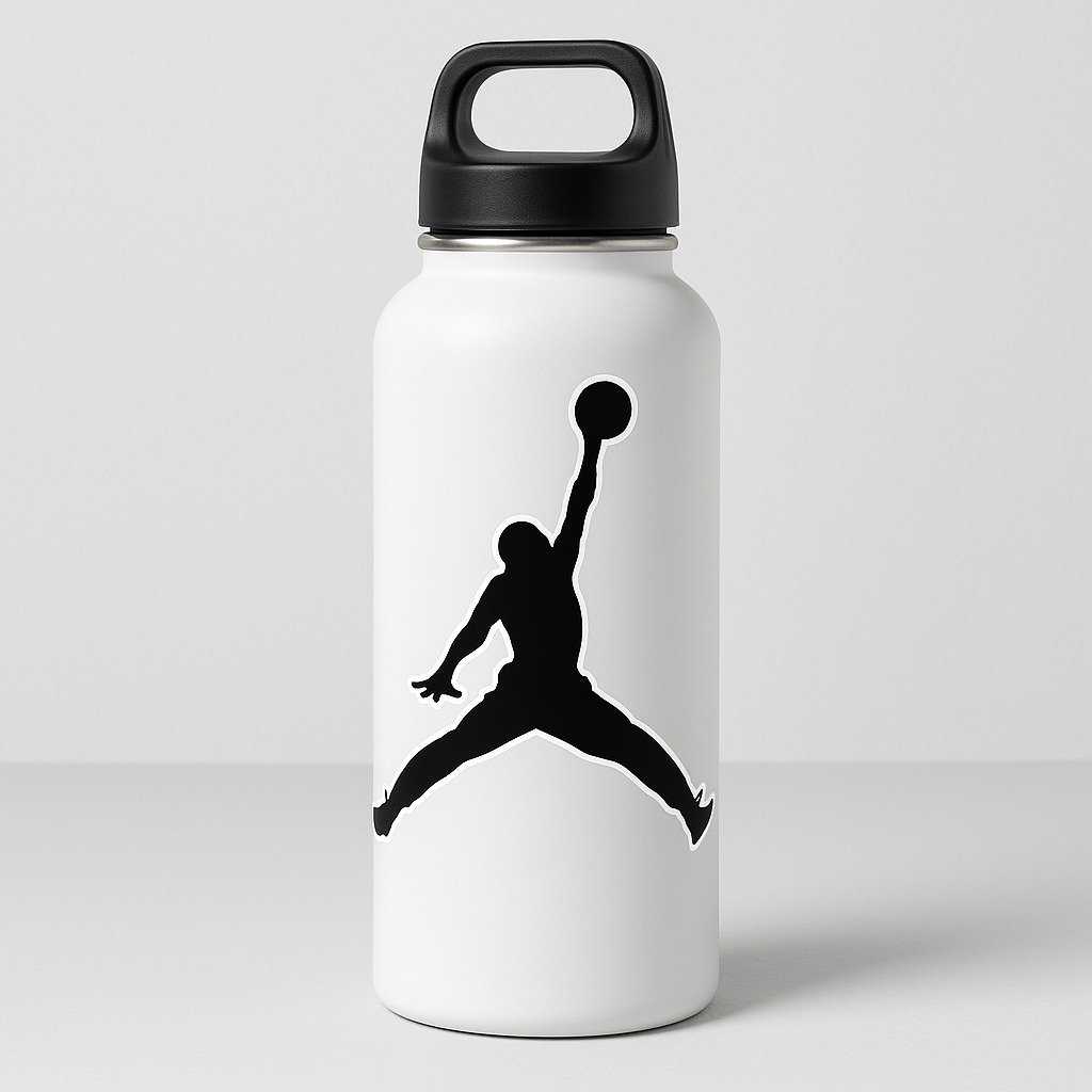 This sticker features a bold and iconic silhouette of a basketball player captured in mid-air, extending one arm high while holding a basketball, with legs spread wide in a dynamic pose. The design symbolizes athleticism, strength, and determination, often associated with the spirit of basketball and sports culture. Its clean black-and-white outline makes it stand out sharply, giving it a stylish and modern look. This type of sticker is not only decorative but also represents motivation, energy, and passion for the game, making it a popular choice for fans, athletes, and sports enthusiasts to place on laptops, water bottles, walls, or gear to showcase their love for basketball and active lifestyle.