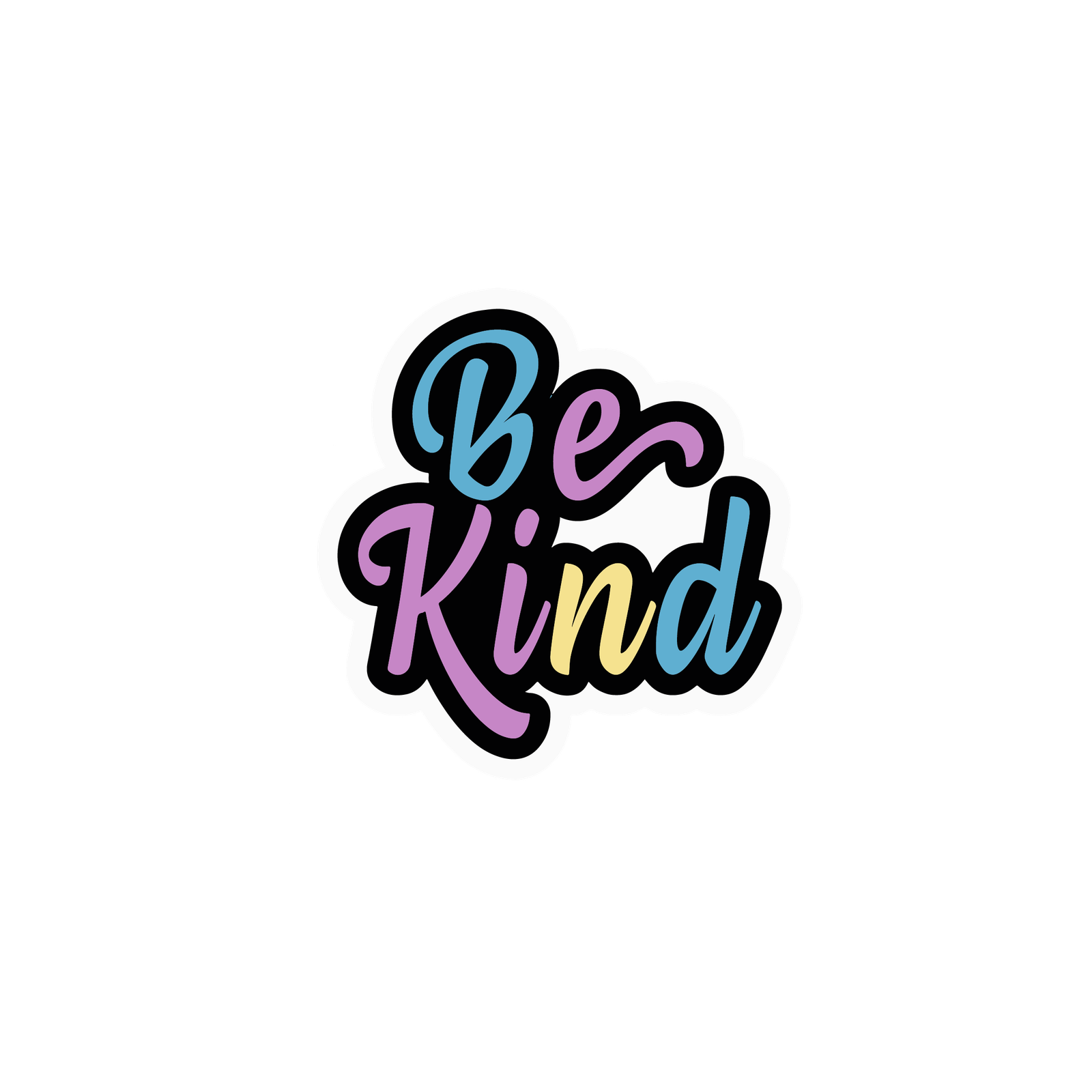 This sticker beautifully displays the motivational phrase “Be Kind” in a vibrant, modern, and eye-catching design. The text is written in a bold cursive style, blending multiple pastel shades like blue, purple, yellow, and pink, which symbolize positivity, warmth, and harmony. The white outline around the lettering gives it a clean and striking contrast, making it pop against darker surfaces. Perfect for laptops, water bottles, notebooks, or phone cases, this sticker serves as a daily reminder to spread kindness, compassion, and positivity wherever you go.