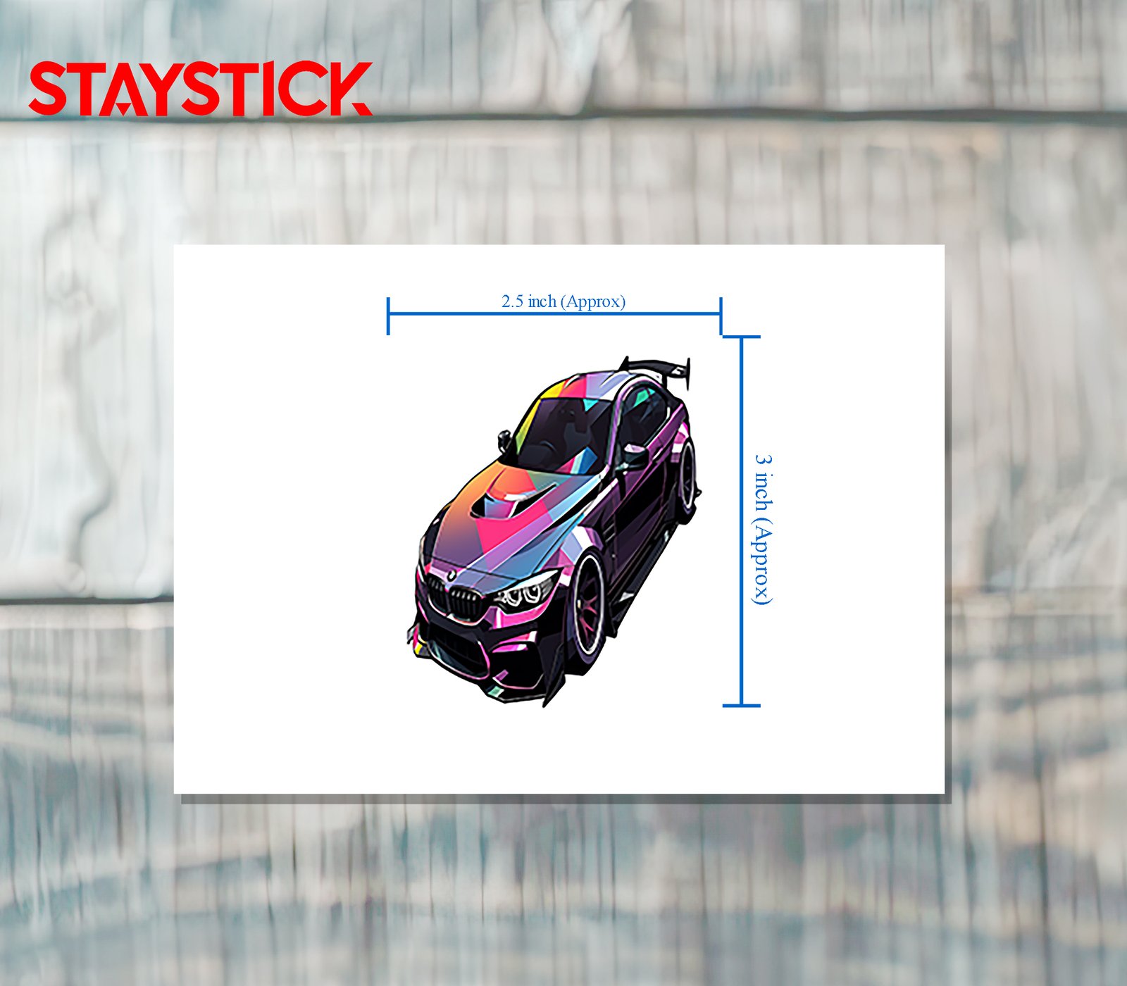 Iridescent sticker of a widebody BMW with geometric color blocks in pink, teal, and orange, glossy highlights that shift with light, perfect for laptops and helmets.