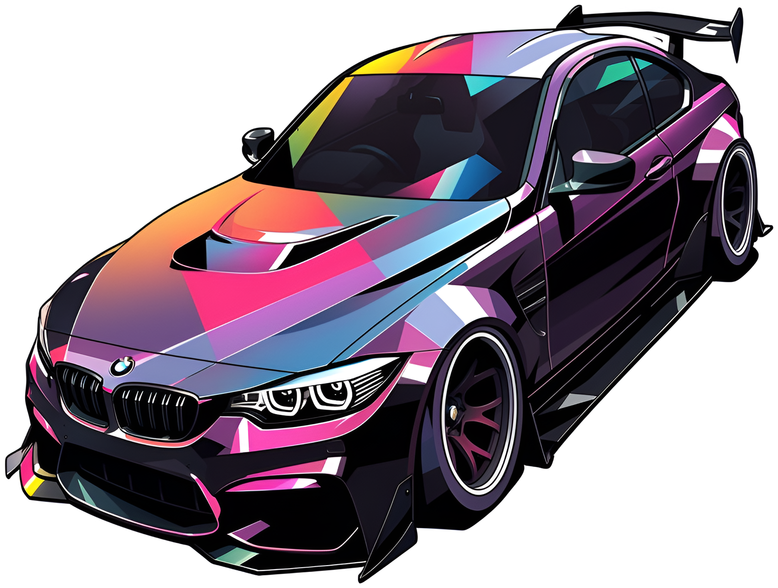 Holographic sports coupe sticker. Neon geometric BMW decal. Rainbow-reflective racing car. Glossy lowrider sticker