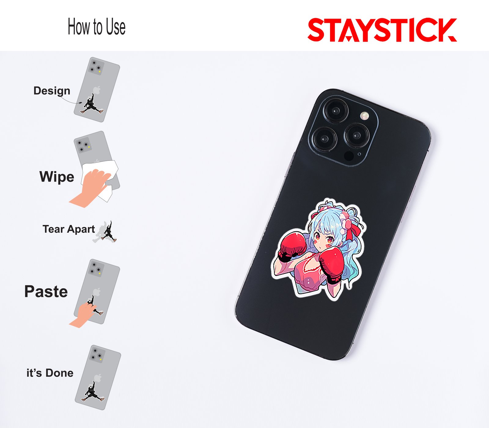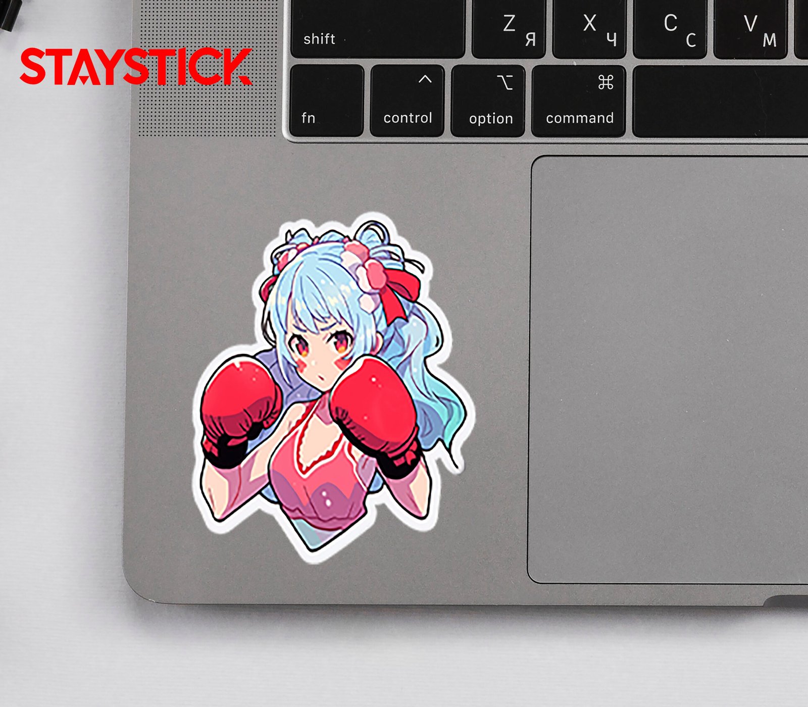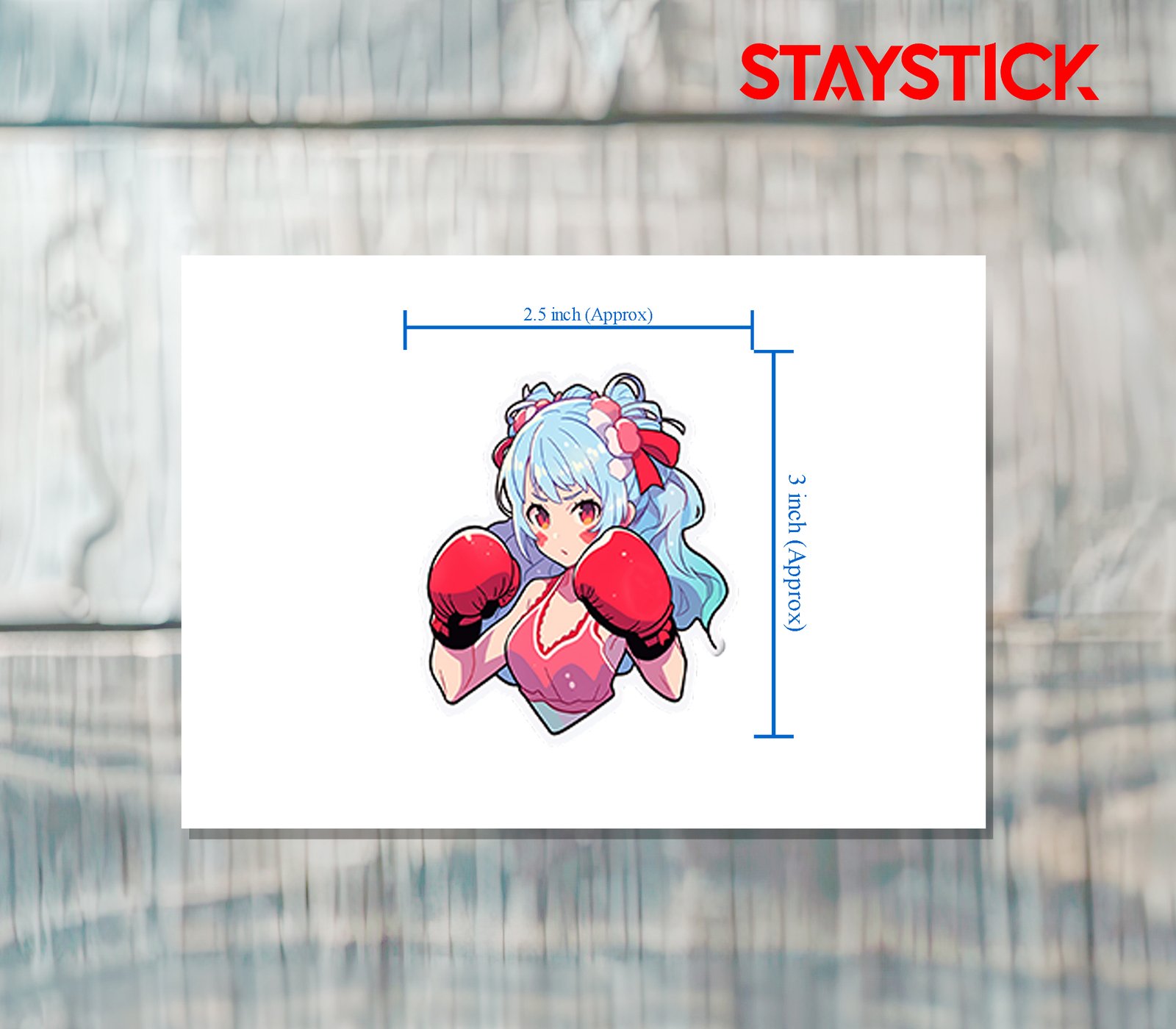This vibrant sticker showcases a dynamic anime-inspired character full of energy and determination. The girl has flowing light blue hair tied up with bright red bows and adorned with floral-like accessories, adding a soft yet bold touch to her fierce look. She wears a sporty red outfit that complements her powerful red boxing gloves. Her intense expression and ready stance capture a strong fighting spirit, blending cuteness with strength. Perfect for representing motivation, resilience, and a never-give-up attitude, this sticker makes a fun and empowering addition to any collection.