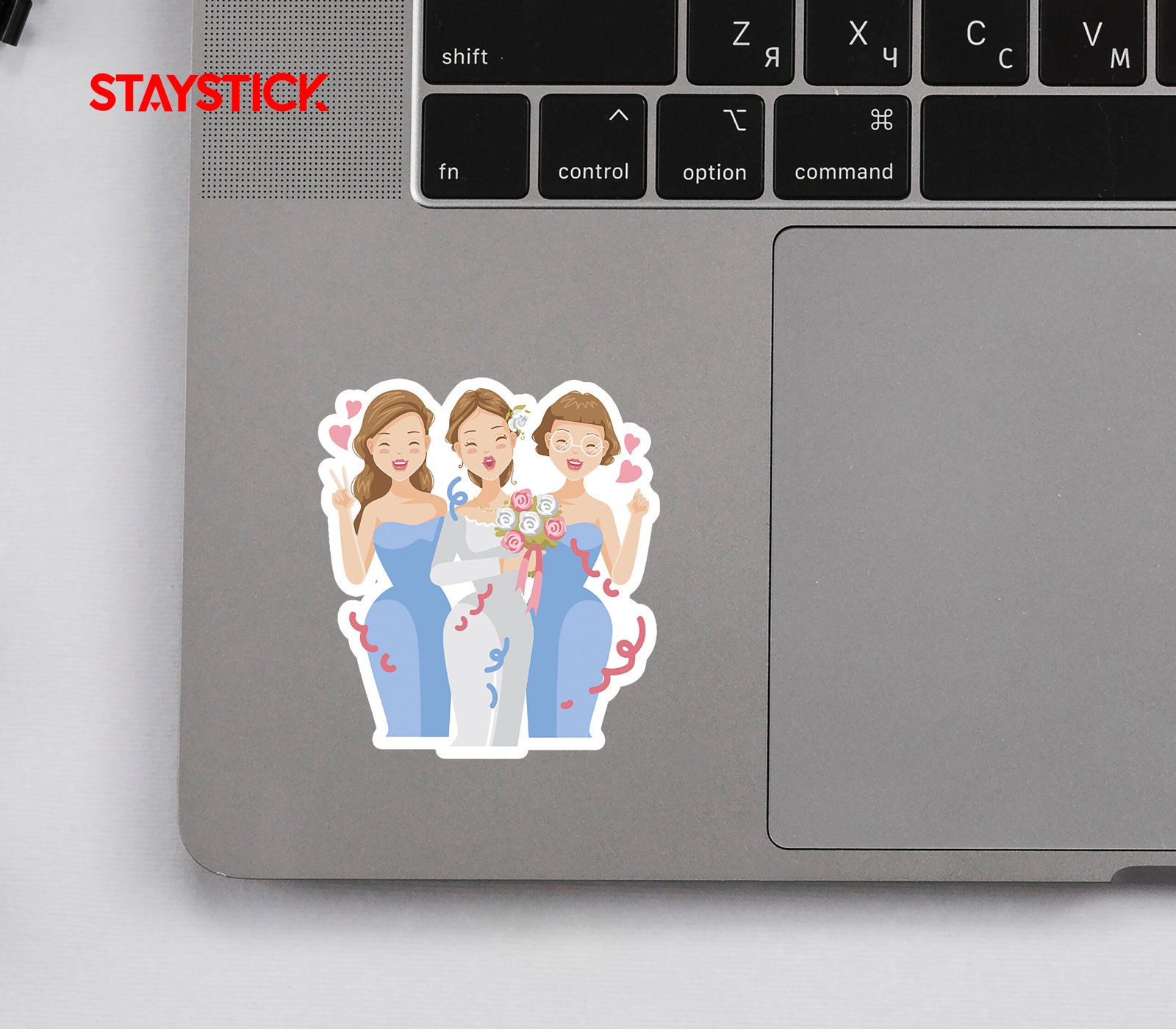 This sticker shows a joyful wedding scene with a smiling bride in a white gown holding a bouquet of pink and white roses, standing alongside two happy bridesmaids dressed in matching light blue dresses. The bride looks radiant with a flower in her hair, while the bridesmaids pose playfully, one flashing a peace sign and the other smiling with round glasses. Pink hearts and colorful confetti surround the trio, adding to the festive and loving atmosphere. This sticker perfectly captures the happiness, friendship, and excitement of a wedding celebration, making it a charming decoration for planners, scrapbooks, or gifts related to weddings and bridal parties.