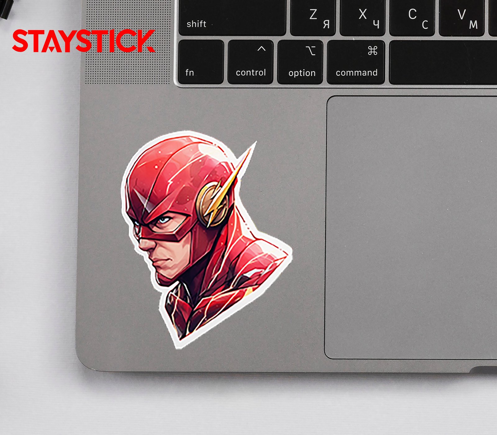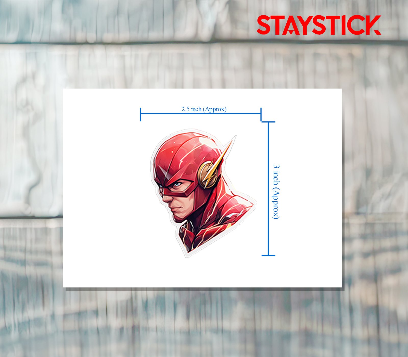 This sticker showcases a dynamic and detailed artwork of the iconic scarlet speedster, known for his unmatched speed and heroic determination. The close-up profile highlights his sleek red suit, etched with glowing lightning streaks that emphasize energy and motion. Golden lightning bolt emblems on his ears add to his instantly recognizable look, symbolizing both power and speed. His intense gaze and sharp features reflect focus, bravery, and readiness for action, while the fiery background enhances the sense of velocity and intensity. Perfect for fans of fast-paced heroes and comic book legends, this sticker brings electrifying energy and inspiration to any surface it adorns.