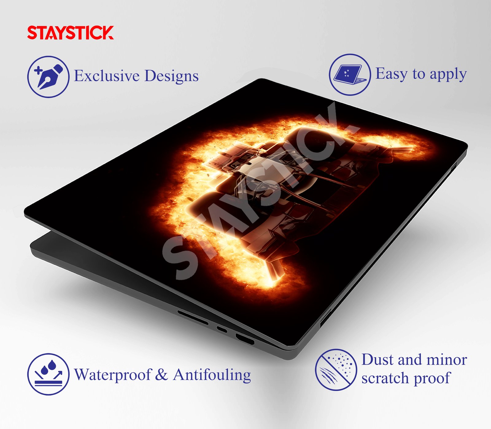 Transform your laptop into a statement of speed and power with this stunning Formula 1–inspired skin sticker. Featuring a sleek race car charging forward through a trail of blazing fire, the design captures the raw adrenaline, precision, and intensity of motorsport. The vivid fiery backdrop highlights the car’s aerodynamic lines, symbolizing unstoppable momentum and passion for victory. Crafted to not only look visually striking but also to protect your device, this laptop skin offers a perfect balance of style and durability. Whether you’re a racing enthusiast, a thrill-seeker, or someone who loves bold and dynamic aesthetics, this skin will turn your laptop into the ultimate expression of energy and performance. Wherever you go, it ensures your device stands out with a fiery, fearless presence.
