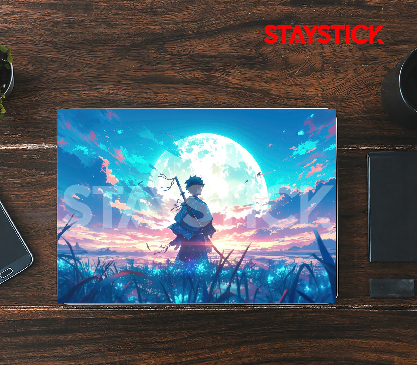 Transform your laptop into a canvas of serenity with this anime-inspired laptop sticker, featuring a lone warrior standing in a glowing field under the majestic full moon. The vivid sky blends shades of blue, pink, and purple, creating a dreamy, cinematic aesthetic.