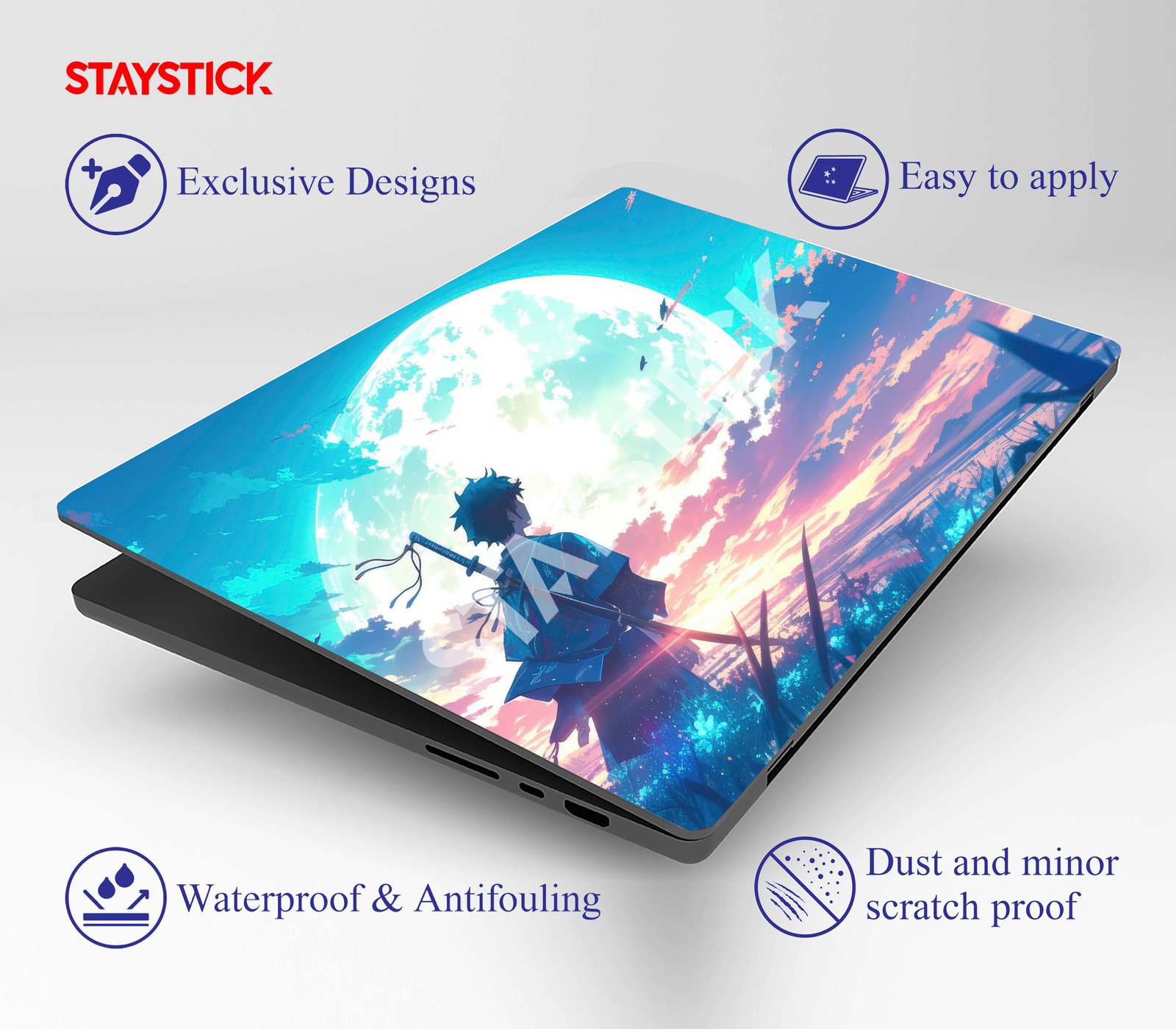 This artistic laptop skin captures the beauty of a night under the moonlight, with a warrior silhouette gazing into the horizon. Surrounded by glowing flowers and vibrant clouds, the design adds both protection and an enchanting touch to your device.