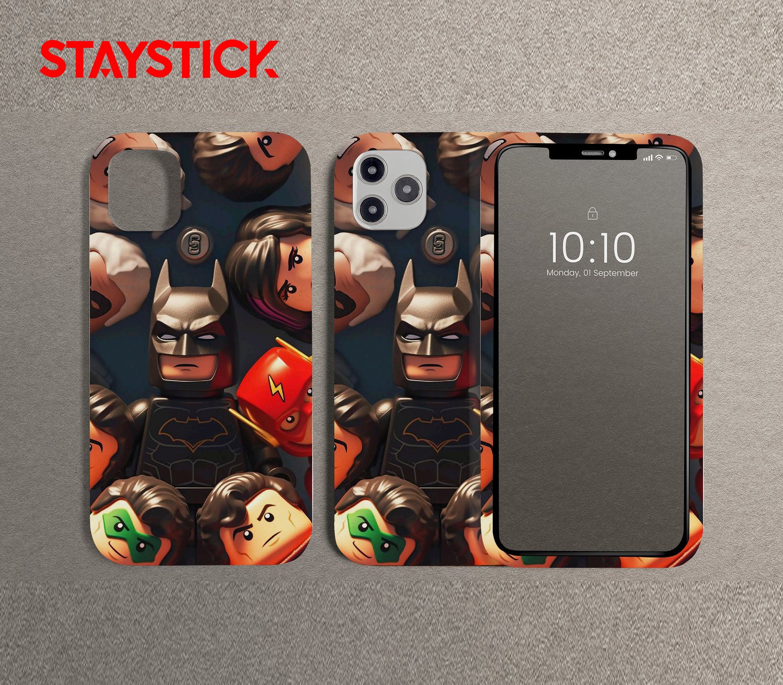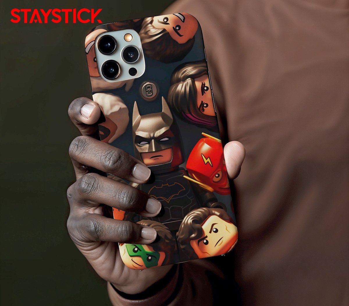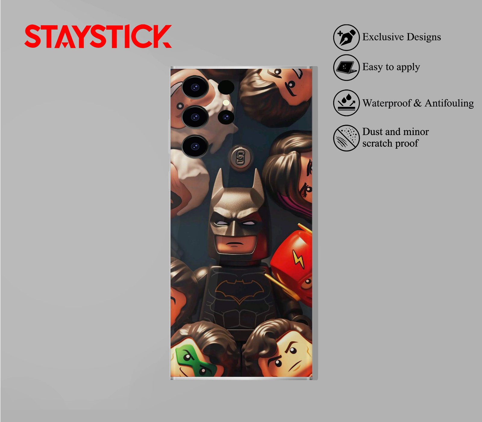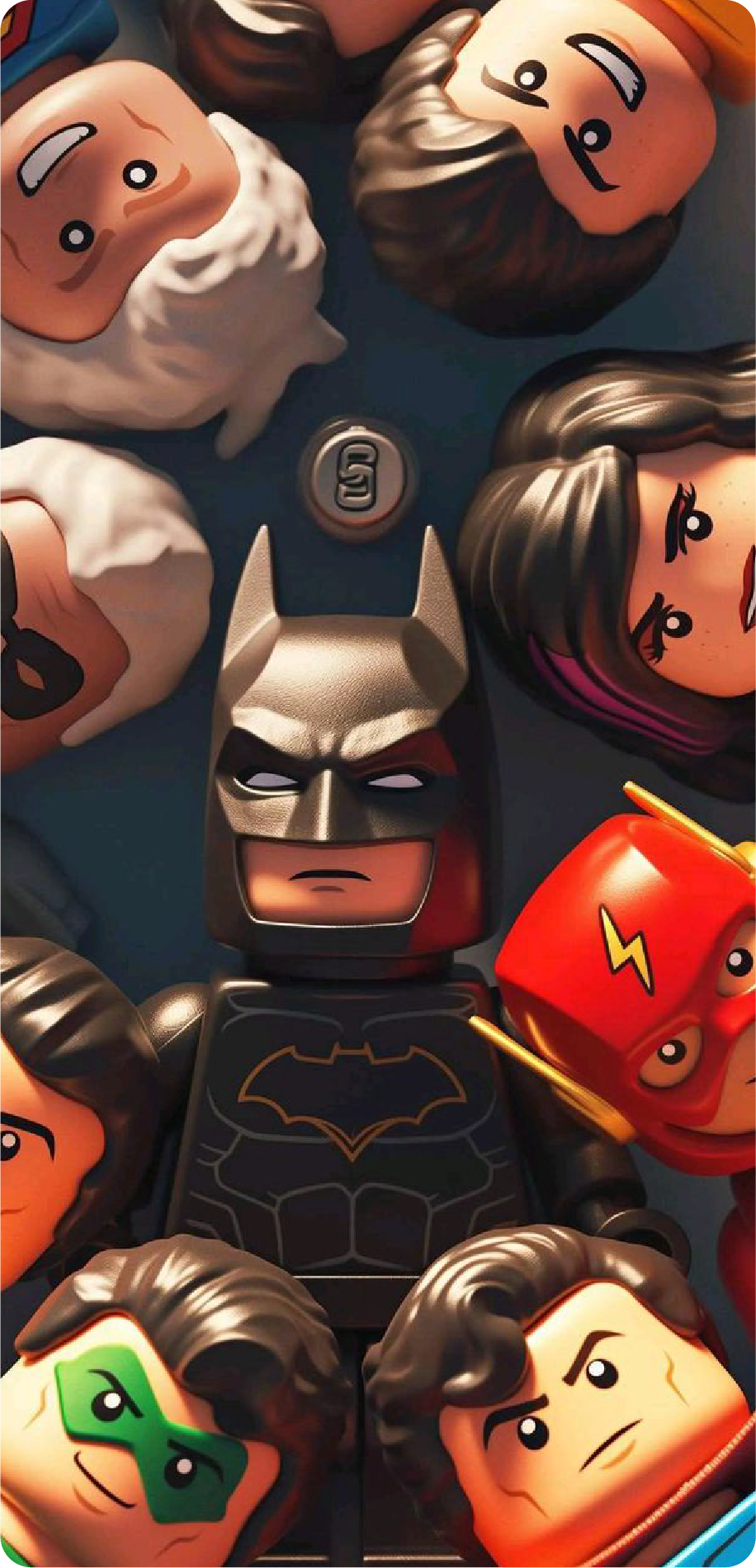 A close-cropped mobile sticker showing a group of toy-style minifigures arranged around a central, brooding bat-hero. Glossy plastic textures, warm rim lighting, and clear printed details (emblems, masks, hair) make each tiny face readable at phone scale while the composition balances playful expressions with a touch of drama.