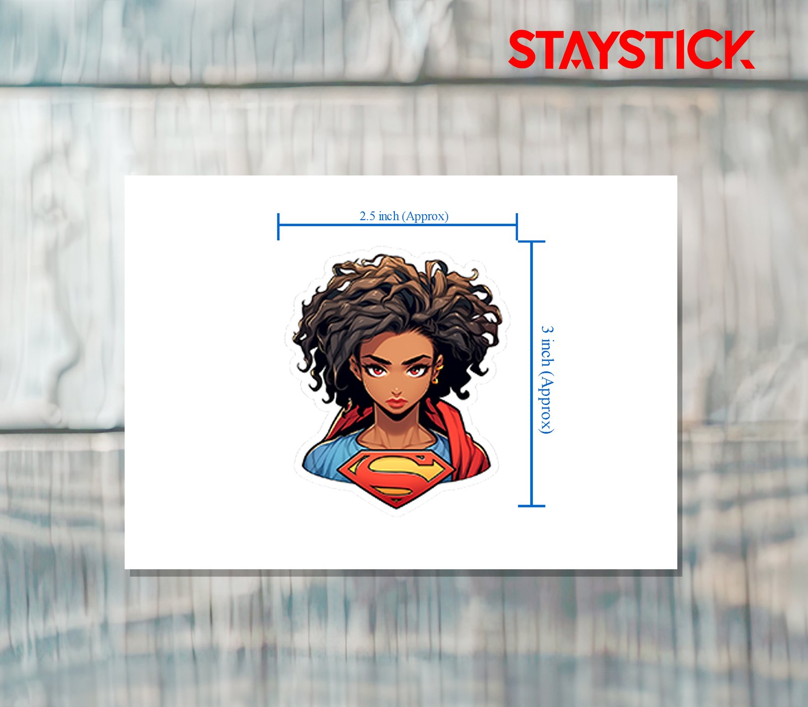 This powerful sticker portrays a modern and dynamic take on Supergirl, showcasing her with voluminous natural curls, intense red eyes, and a determined expression that radiates strength and confidence. She proudly wears the classic blue suit with the legendary “S” shield emblazoned on her chest, paired with a flowing red cape that emphasizes her heroic presence. The design blends comic-book energy with a fresh, contemporary aesthetic, making it a perfect choice for fans of superheroes who want to celebrate diversity, empowerment, and bold individuality. Ideal for decorating laptops, journals, water bottles, or any surface that could use a touch of heroic flair.+