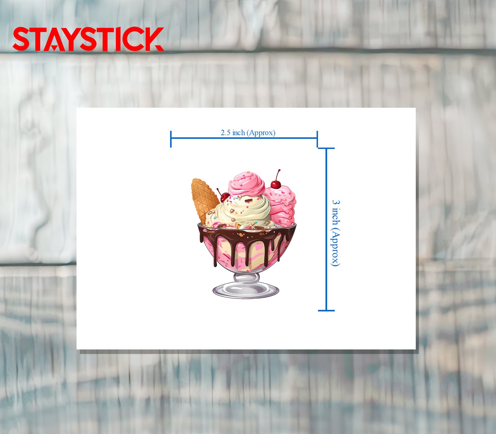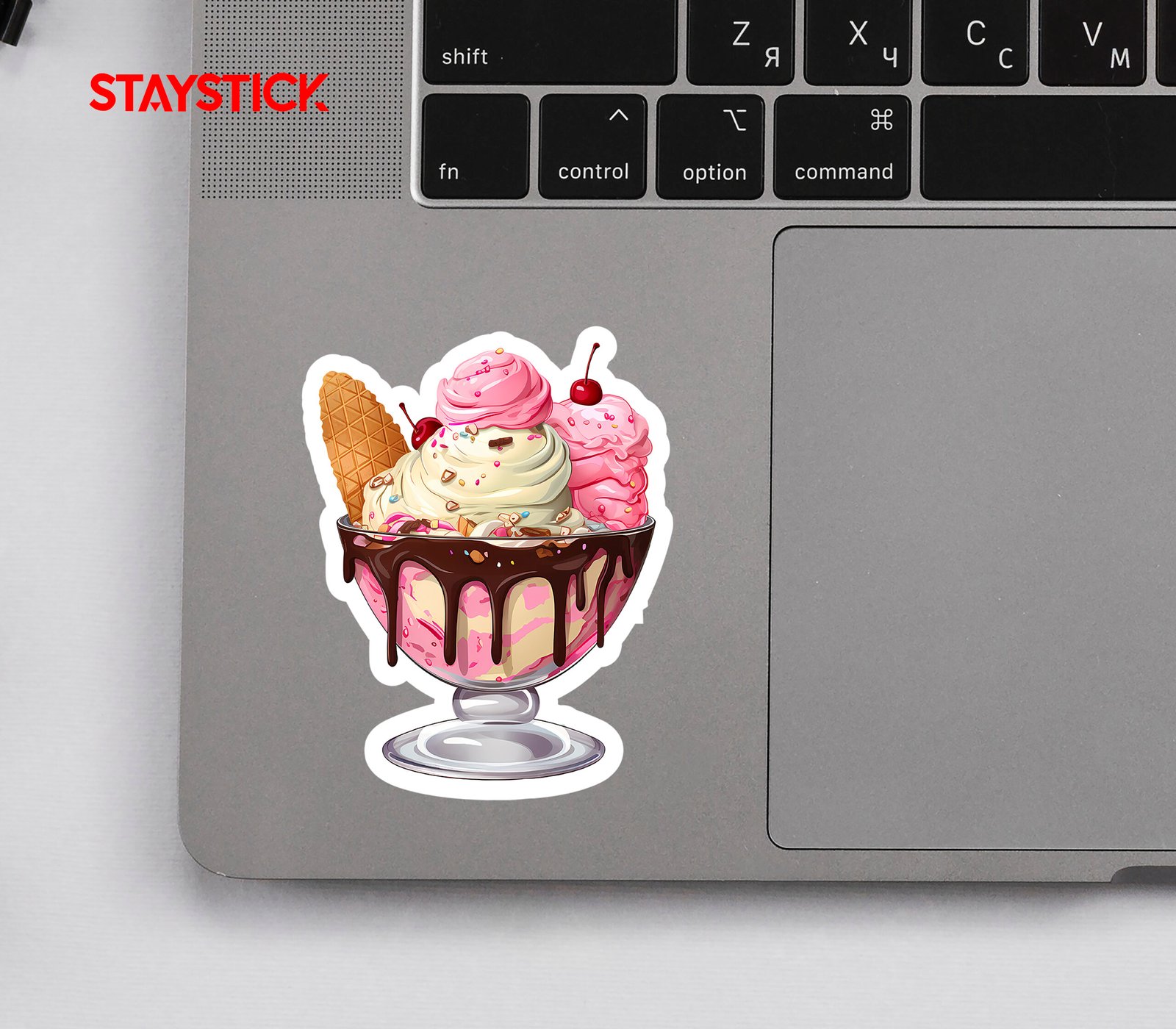 This vibrant sticker features a delightful cartoon illustration of an ice cream sundae. The sundae is piled high with scoops of pink and vanilla ice cream, topped with cherries, colorful sprinkles, and crunchy nuts. Rich chocolate syrup cascades down the sides of the glass. A crispy waffle cone adds a fun detail. Ideal for decorating laptops, notebooks, water bottles, and more. Perfect for ice cream lovers of all ages.