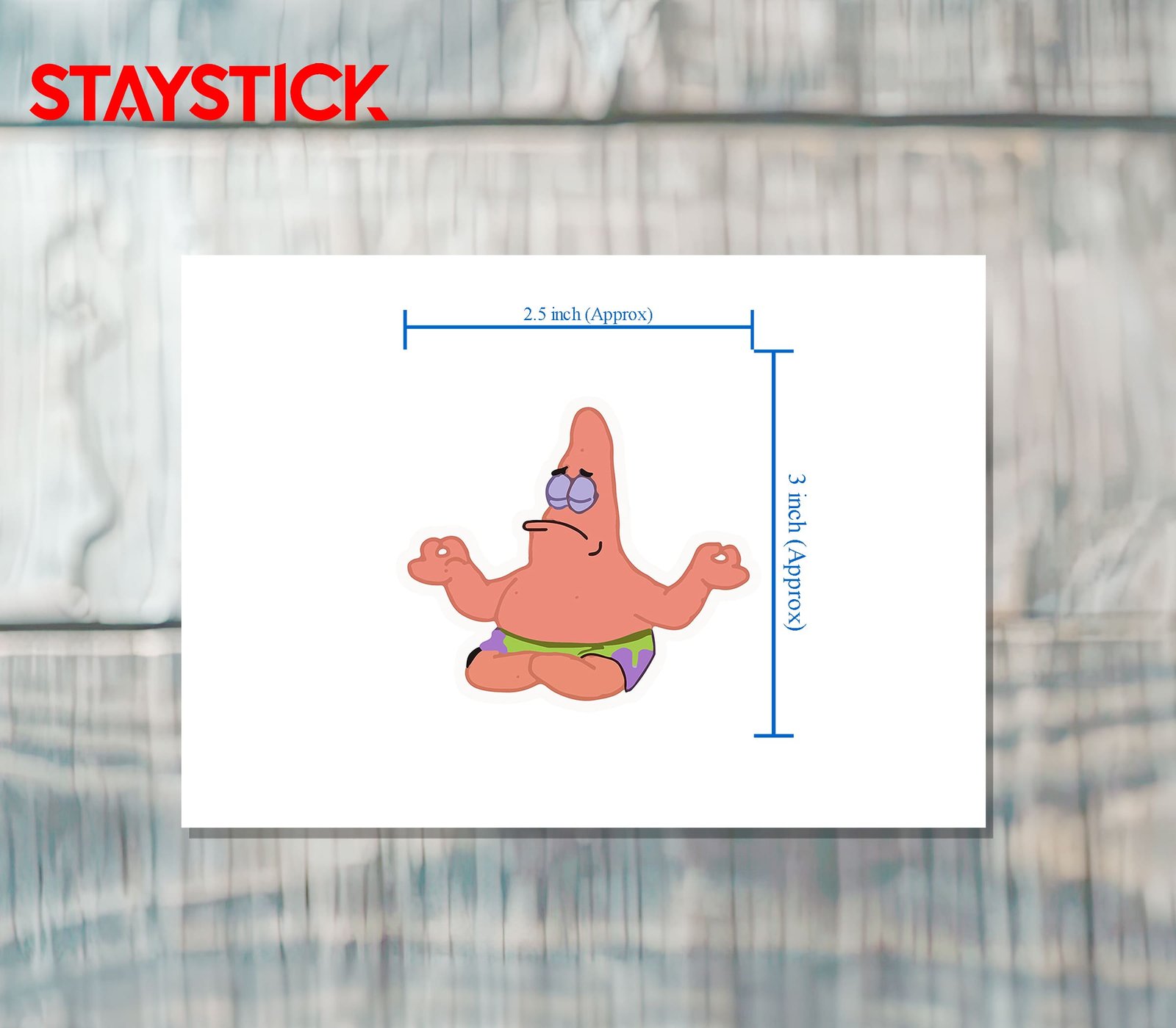 This sticker features a pink cartoon starfish sitting cross-legged with eyes half-closed, hands forming a classic meditation “okay” gesture, and wearing colorful green shorts with purple spots. The relaxed yet slightly tired expression adds a humorous twist, making it perfect for anyone who enjoys mixing chill vibes with comedy. Its clean white border makes it pop on laptops, water bottles, phone cases, or notebooks, serving as a fun reminder to stay calm, centered, and maybe a little silly — even when life gets hectic.