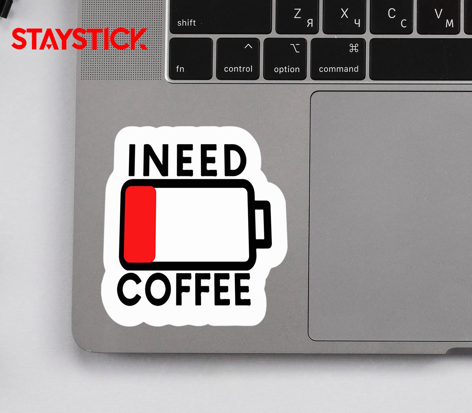 This sticker features a fun and relatable design that combines humor with everyday life. At the center, it shows a nearly empty battery icon, with only a small red section filled, symbolizing low energy and exhaustion. Above and below the battery, the bold black text reads “I NEED COFFEE”, making it clear that coffee is the “fuel” needed to recharge and get back to full power. The clean, modern design with a white background and strong contrast makes the message stand out. Perfect for coffee lovers, this sticker playfully illustrates how many people feel without their morning cup of coffee—drained and running on empty, just like a low battery.