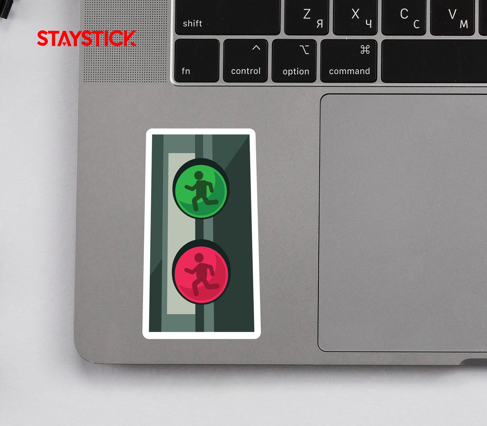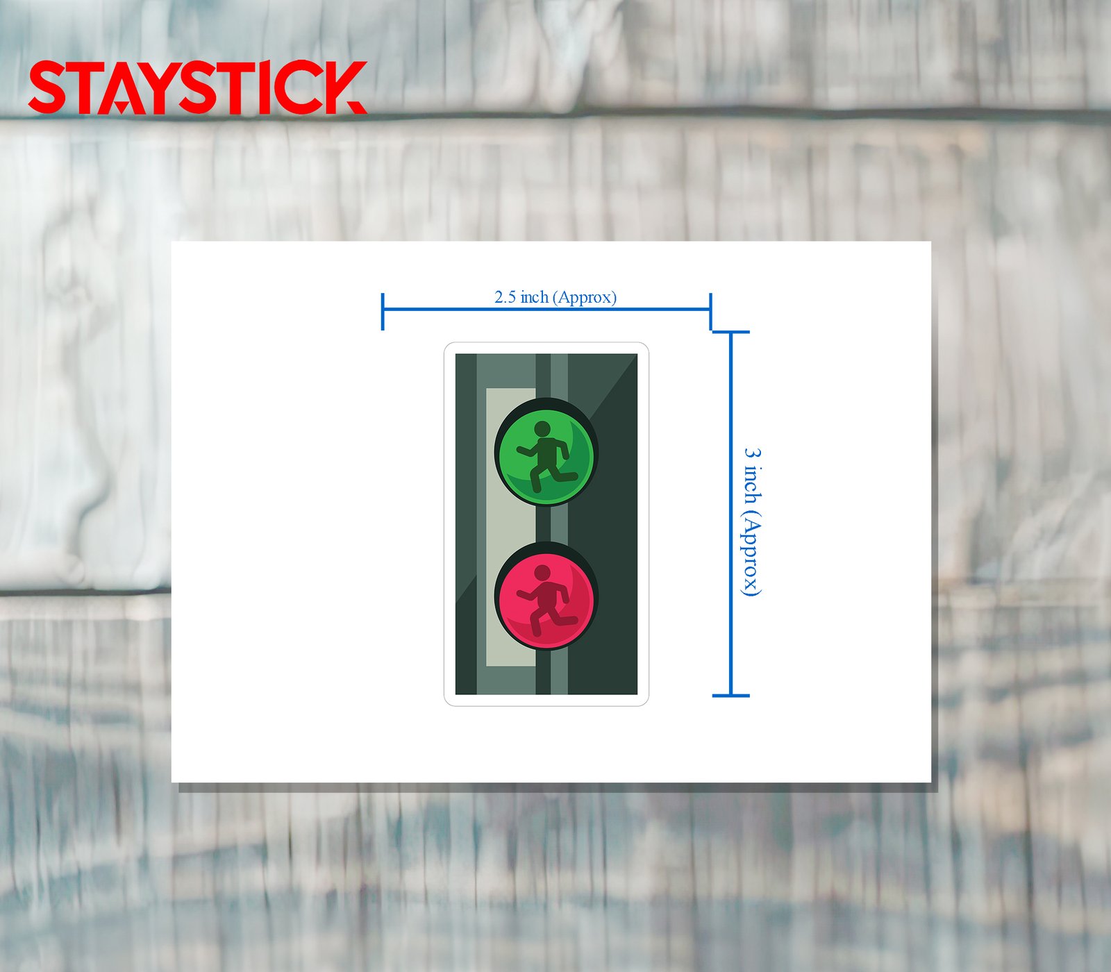 “This sticker illustrates a pedestrian crossing signal with two lights. The green light at the top features a walking person symbol, indicating it is safe for pedestrians to cross. The red light at the bottom shows a standing figure, signaling pedestrians to stop and wait.A clear and simple representation of a pedestrian traffic light, this sticker uses universally recognized symbols for walk and don’t walk. The design is ideal for safety awareness materials, educational use, or as a decorative element in themes related to traffic rules and road safety.”
