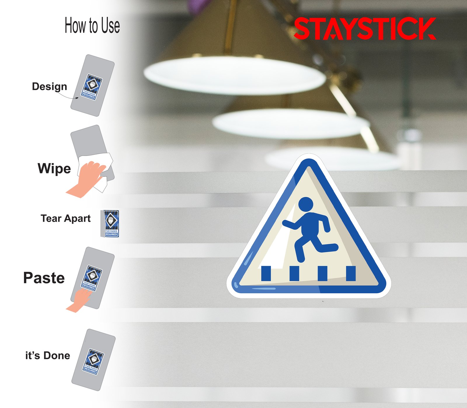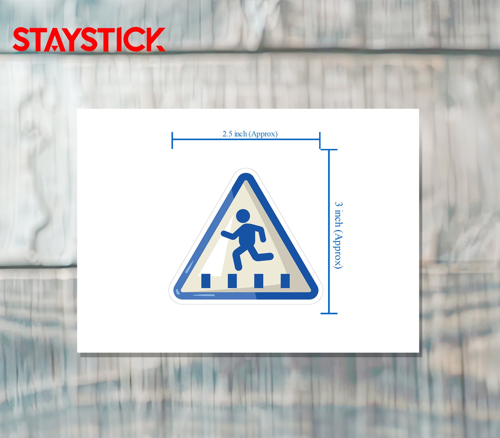 “This sticker features a blue triangular traffic sign with a human figure walking across a striped path, symbolizing a pedestrian crossing zone. It serves as a safety reminder for vehicles to slow down and give way to pedestrians.A pedestrian crossing safety sticker designed with a blue border triangle and a person icon walking on zebra stripes. Commonly used in traffic awareness campaigns, educational materials, or as a safety marker to emphasize pedestrian-friendly areas.”