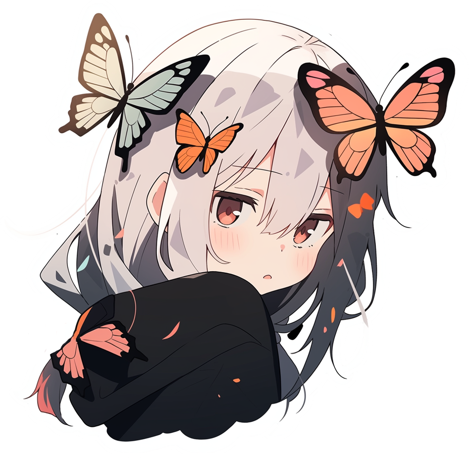 This sticker features a beautifully drawn anime girl with soft white and gray hair, styled in a loose, flowing cut. Her gentle expression and blushing cheeks add a sense of calmness and subtle shyness. Surrounding her are several colorful butterflies — orange, peach, and cream — perched delicately on her hair, clothes, and shoulder. She wears a dark hoodie that contrasts with her pale complexion and light-colored hair, making the butterflies stand out even more. The artwork blends elegance with cuteness, making it a perfect decorative sticker for laptops, journals, water bottles, or any surface that could use a touch of dreamy, aesthetic charm.