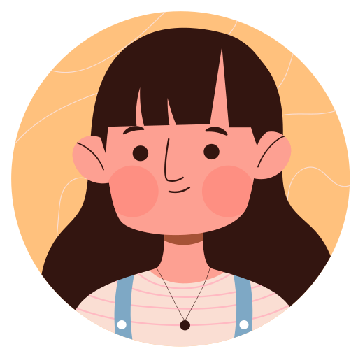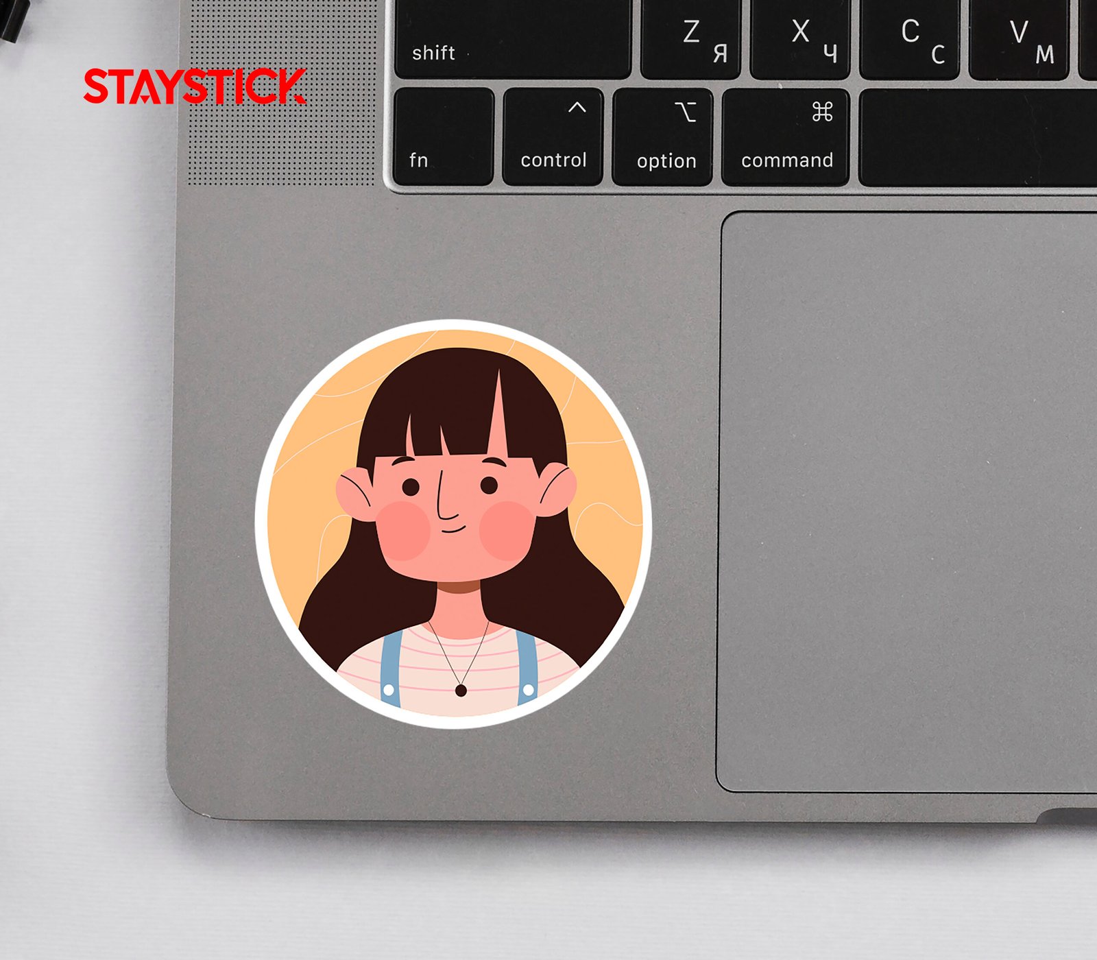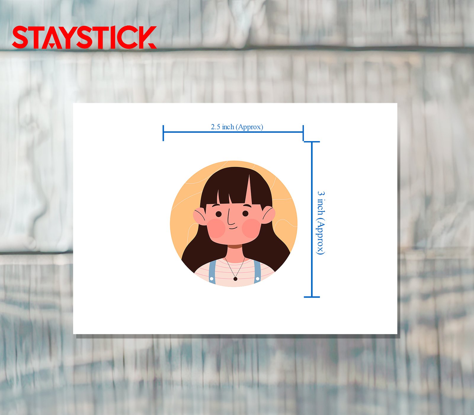 This sticker showcases a charming cartoon illustration of a young girl with straight, long brown hair and a warm smile. She is dressed in a light-colored striped shirt with blue suspenders and a simple black necklace, adding a casual yet stylish touch to her look. The circular design is set against a soft peach background with subtle line details, giving the sticker a friendly and cheerful vibe. Perfect for personalizing notebooks, laptops, water bottles, or planners, this sticker adds a touch of positivity and charm wherever it’s placed.