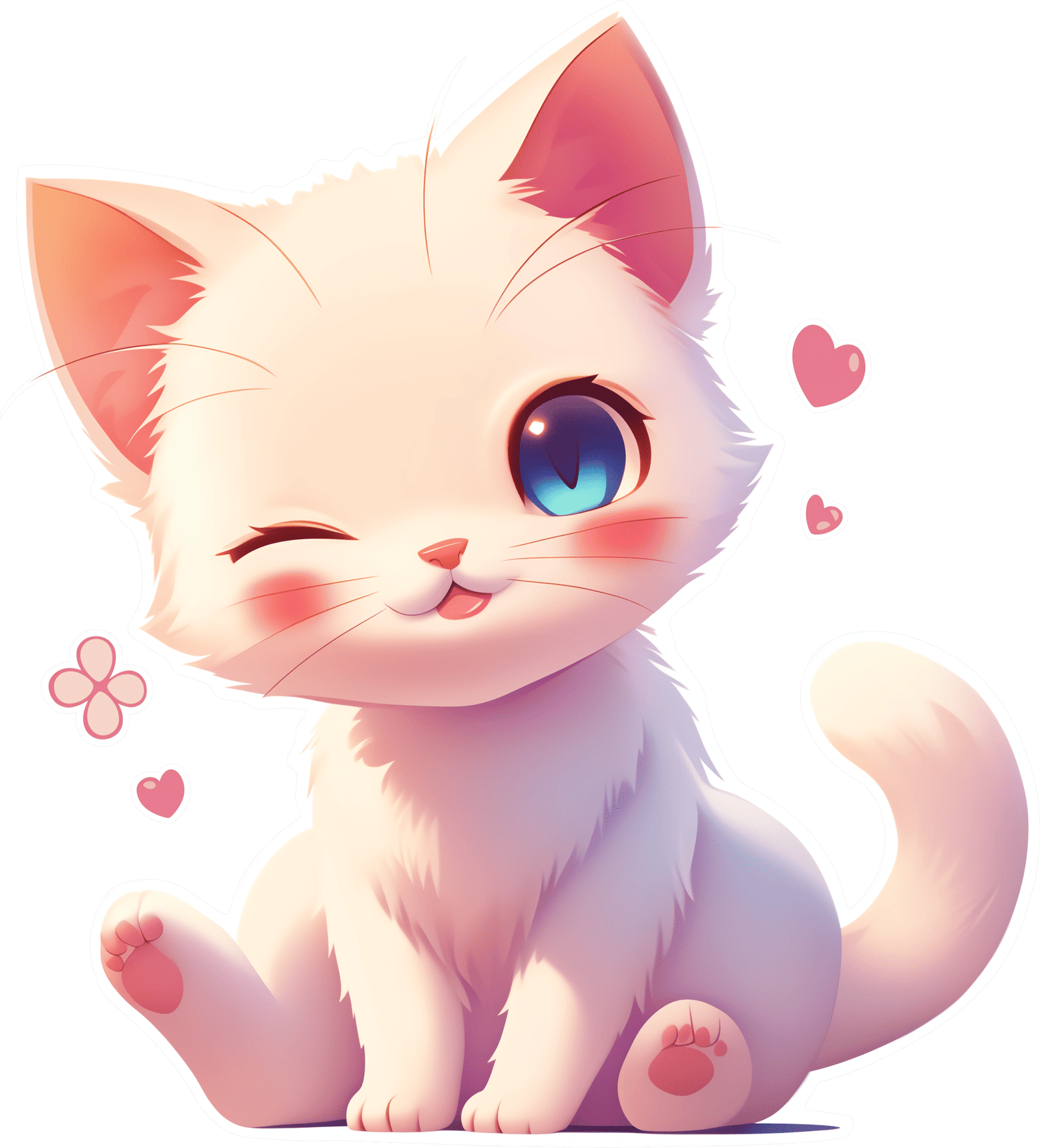 Holographic winking kitten. Pastel neon chibi cat. Iridescent kawaii sticker. Sparkly heart-sprinkled kitty. Shimmery blue‑eyed feline
