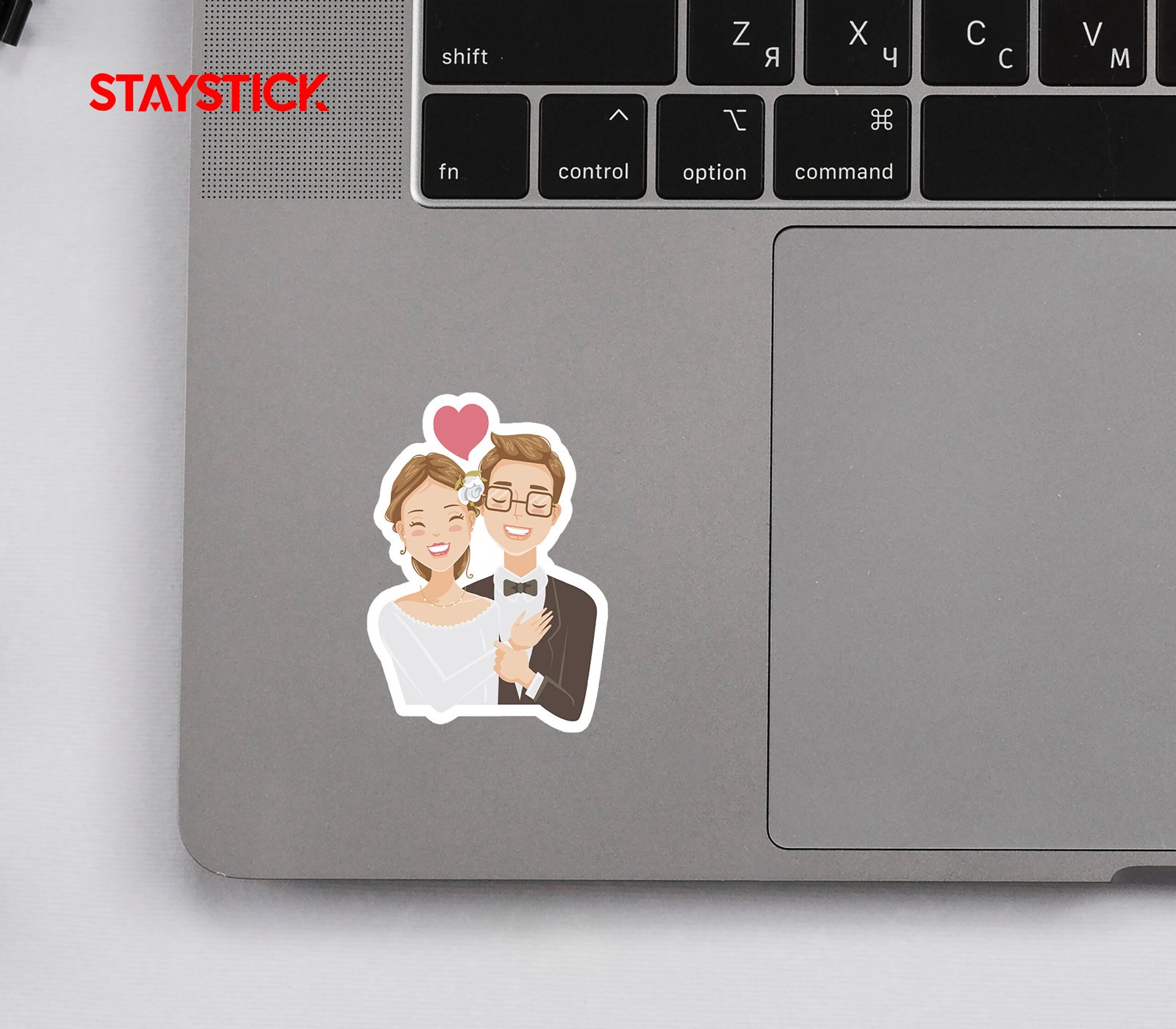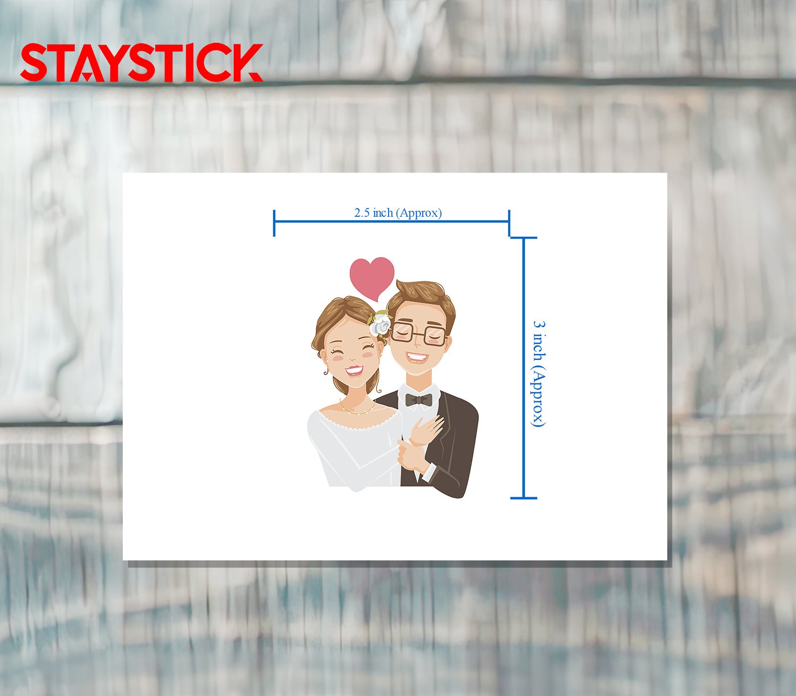 A cute wedding couple sticker showing a happy bride and groom with a heart above them.