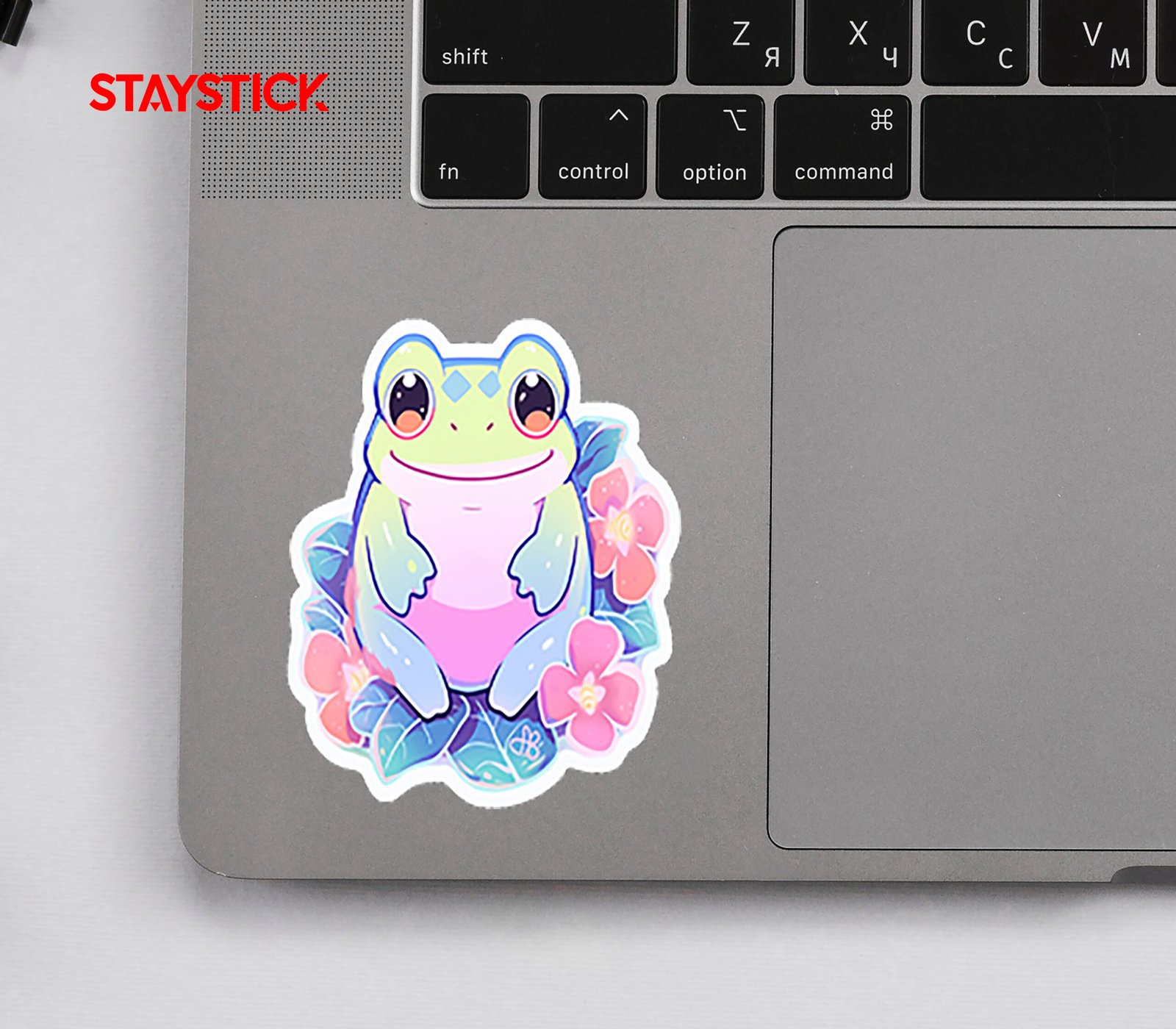 Iridescent hologram sticker of a chubby pastel frog with big glossy eyes and rosy cheeks, sitting on teal leaves and surrounded by soft pink flowers; shimmer shifts from mint to lavender as it tilts.