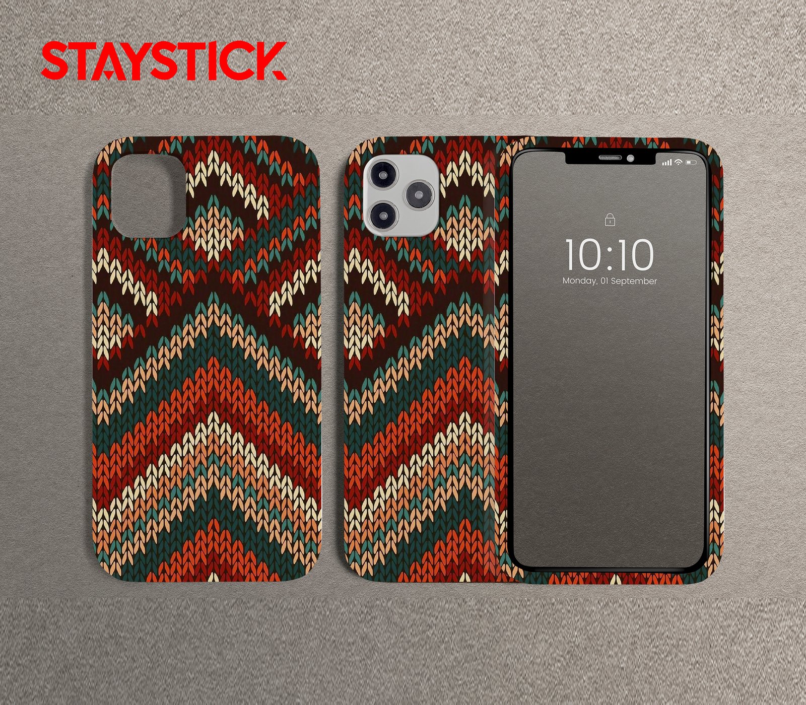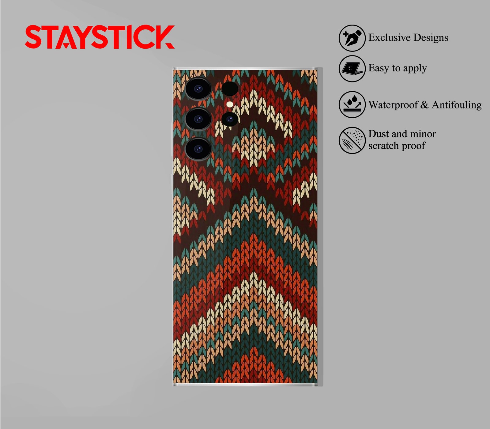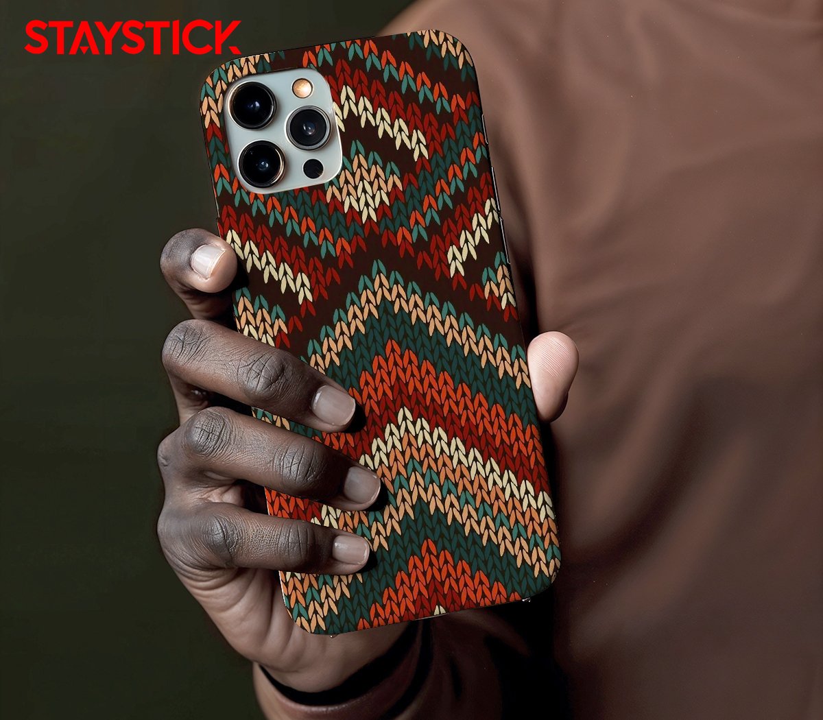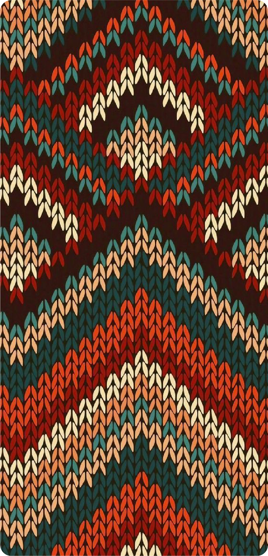 A close-up mobile sticker that mimics chunky knit stitches arranged into repeating chevrons and diamond medallions. The palette mixes deep rust, forest teal, soft peach, and creamy ivory on a dark background, giving a warm, tactile feel that reads well at small sizes.