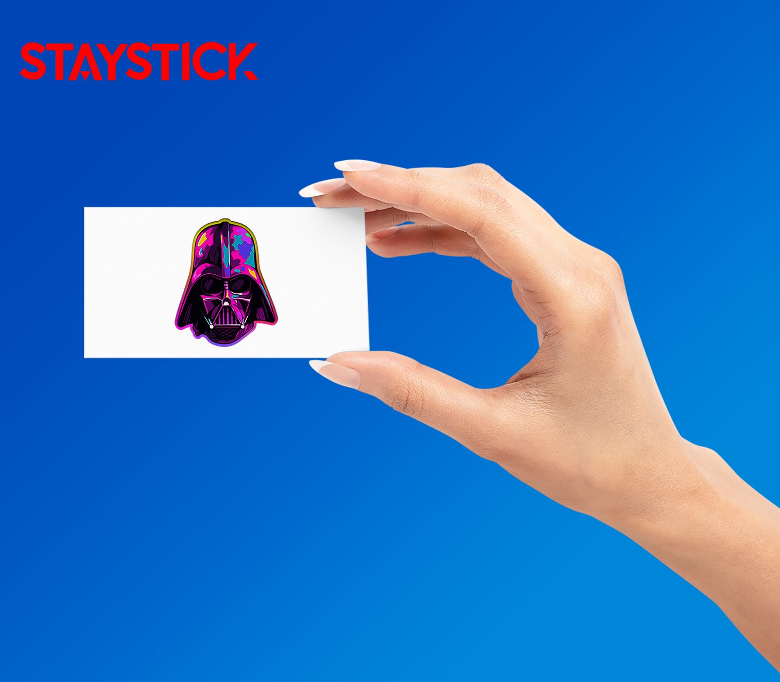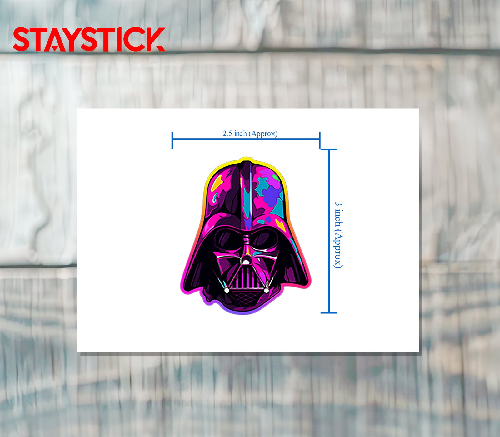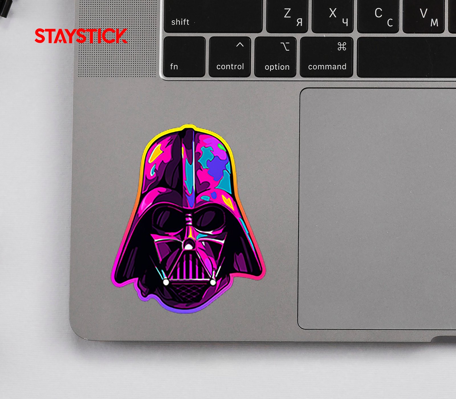 Iridescent hologram of a menacing black helmet rendered in vivid neon pinks, cyans, and golds; glossy highlights and bold outlines give it a dramatic, collectible look for laptops or skate decks.