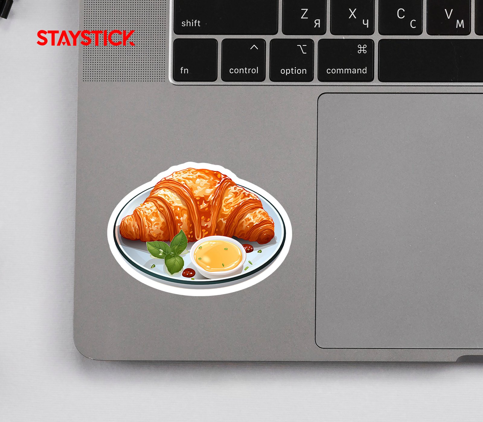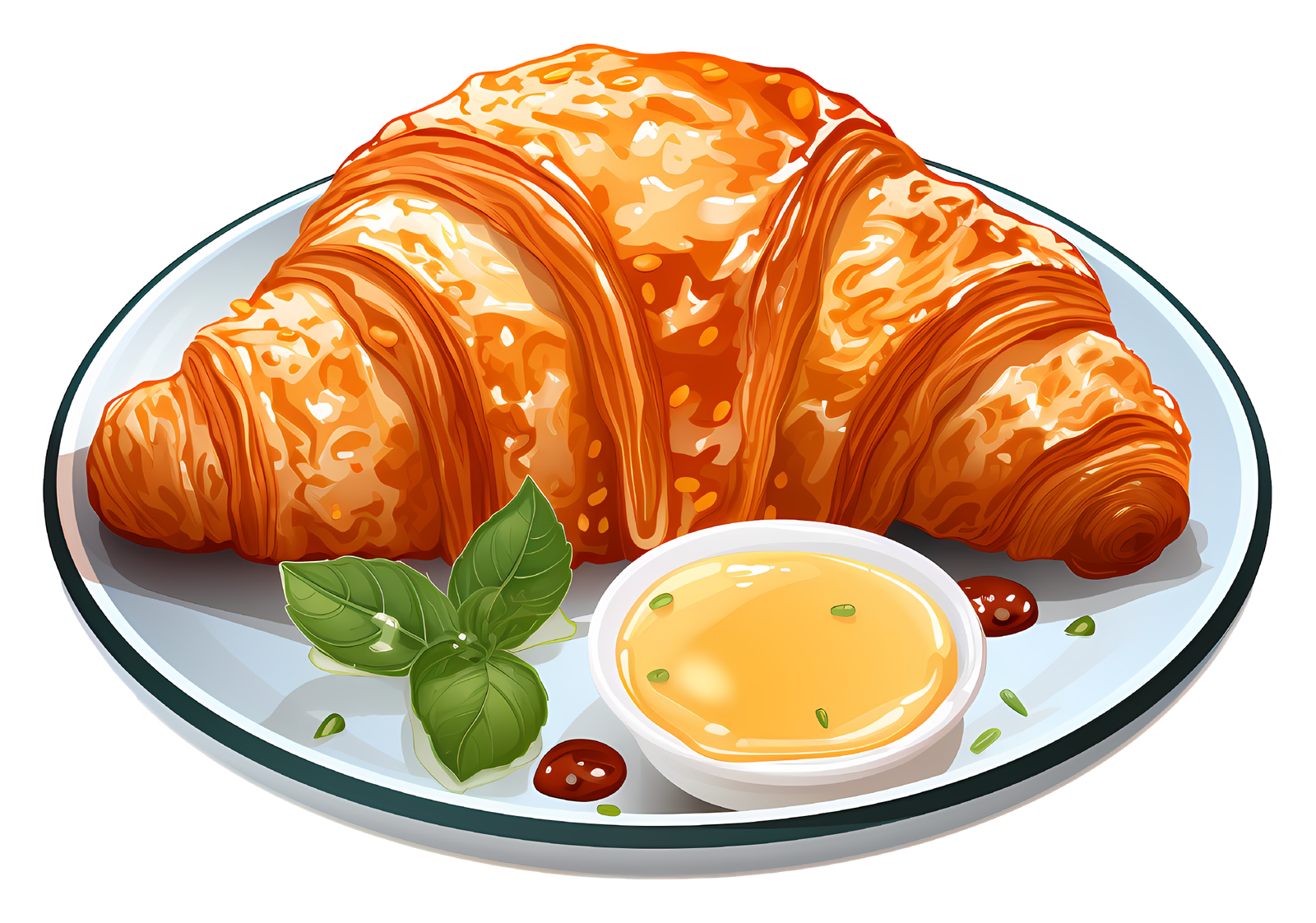 This vibrant sticker showcases a delicious-looking croissant, presented on a plate with a side of flavorful sauce and fresh basil leaves. The detailed illustration captures the flaky texture of the croissant and the rich colors of the toppings. Ideal for decorating laptops, journals, water bottles, or any surface that needs a touch of culinary charm. Great for food lovers, bakers, and anyone who enjoys a touch of gourmet style!