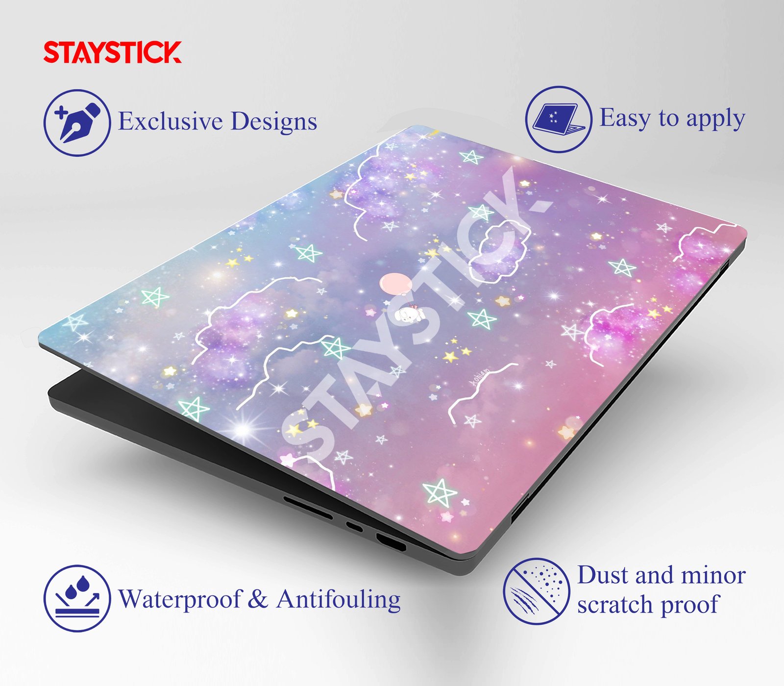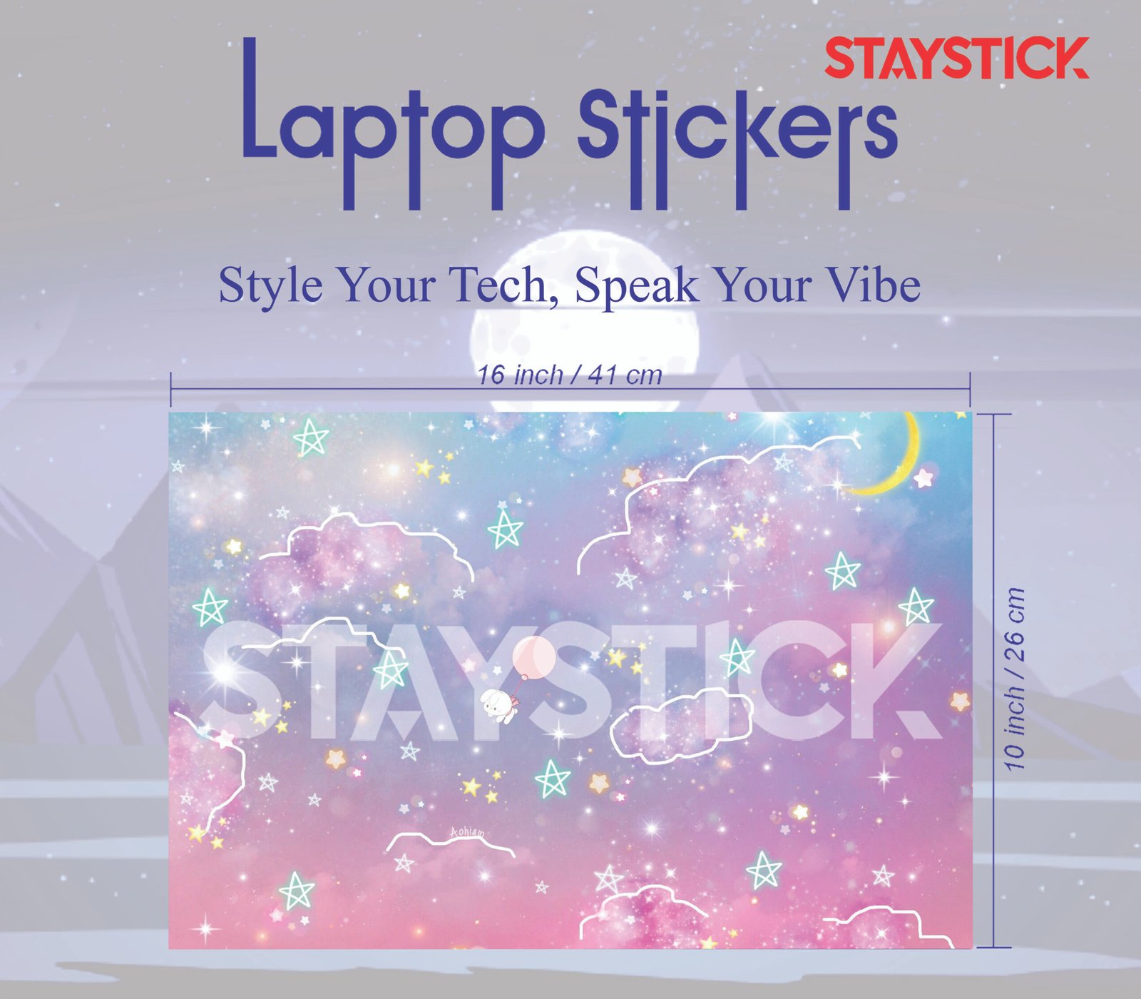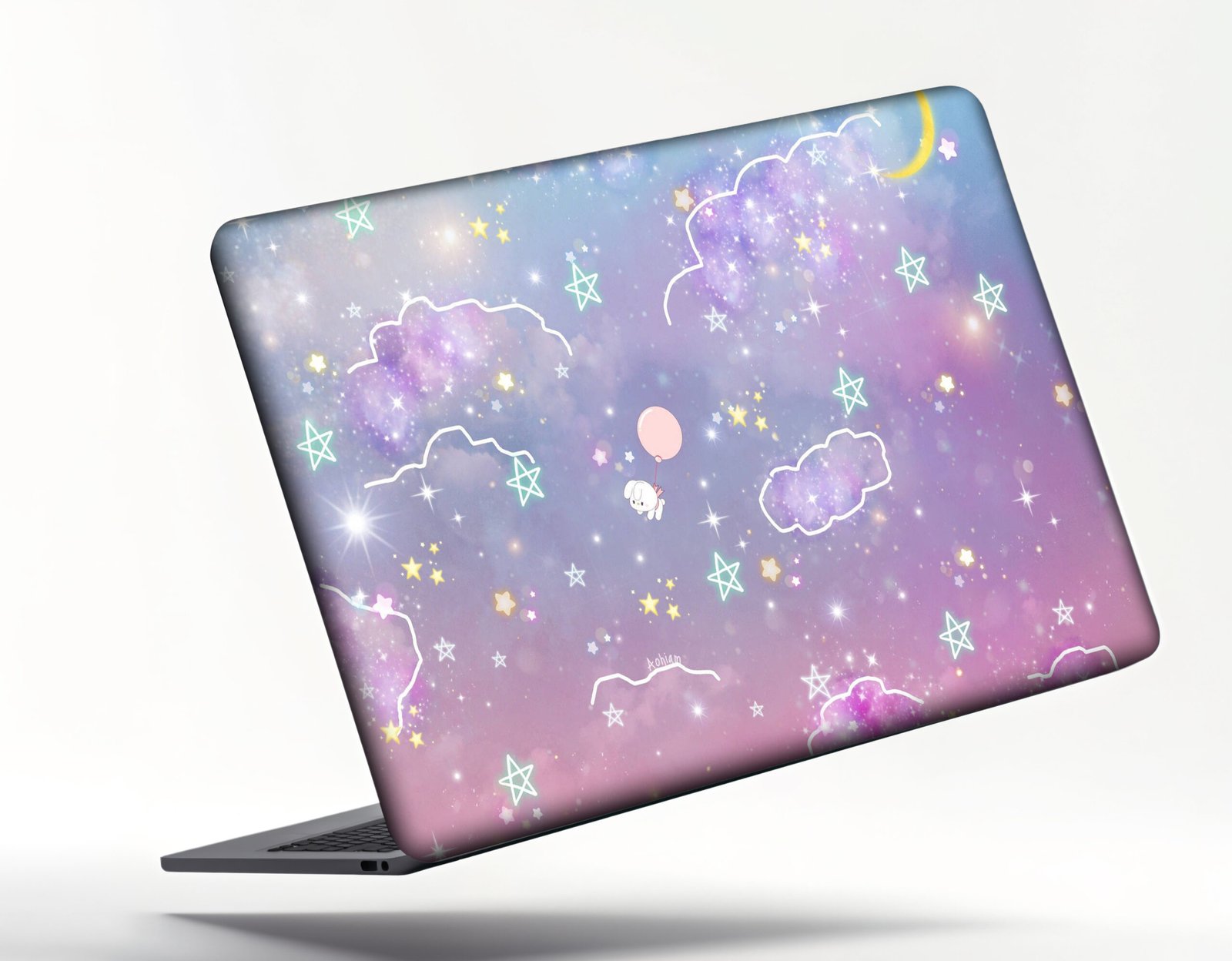 This laptop sticker brings a touch of fantasy and charm to your device with its enchanting design. The backdrop features soft pastel hues of purple, pink, and blue, reminiscent of a dreamy galaxy filled with twinkling stars. Playful white clouds and glowing stars are scattered throughout the design, enhancing the magical feel. At the center, a cute character with a balloon floats serenely, adding a lighthearted and adorable touch. Perfect for those who love whimsical, dreamy aesthetics, this sticker transforms your laptop into a fun and creative accessory.