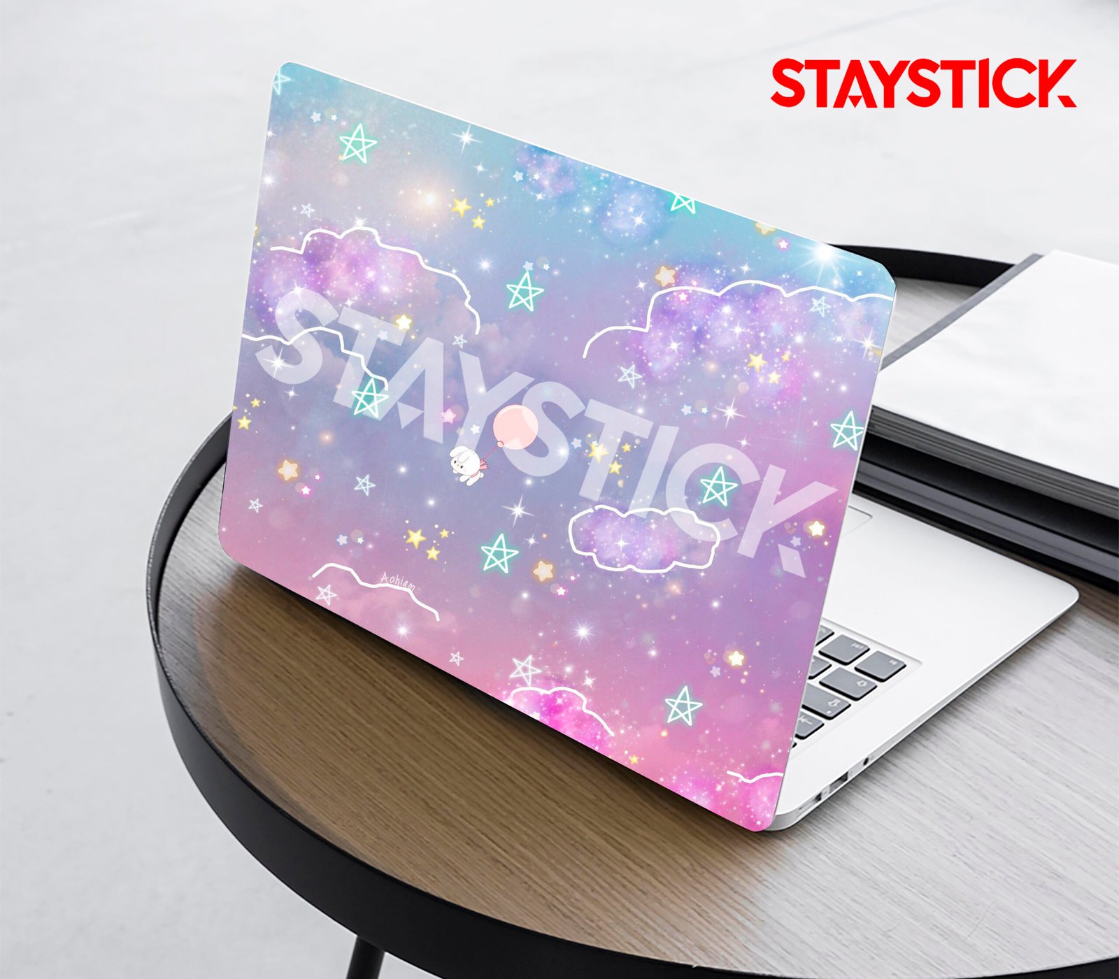 “A pastel-colored laptop sticker featuring a whimsical cloud and star design, with a cute character holding a balloon.