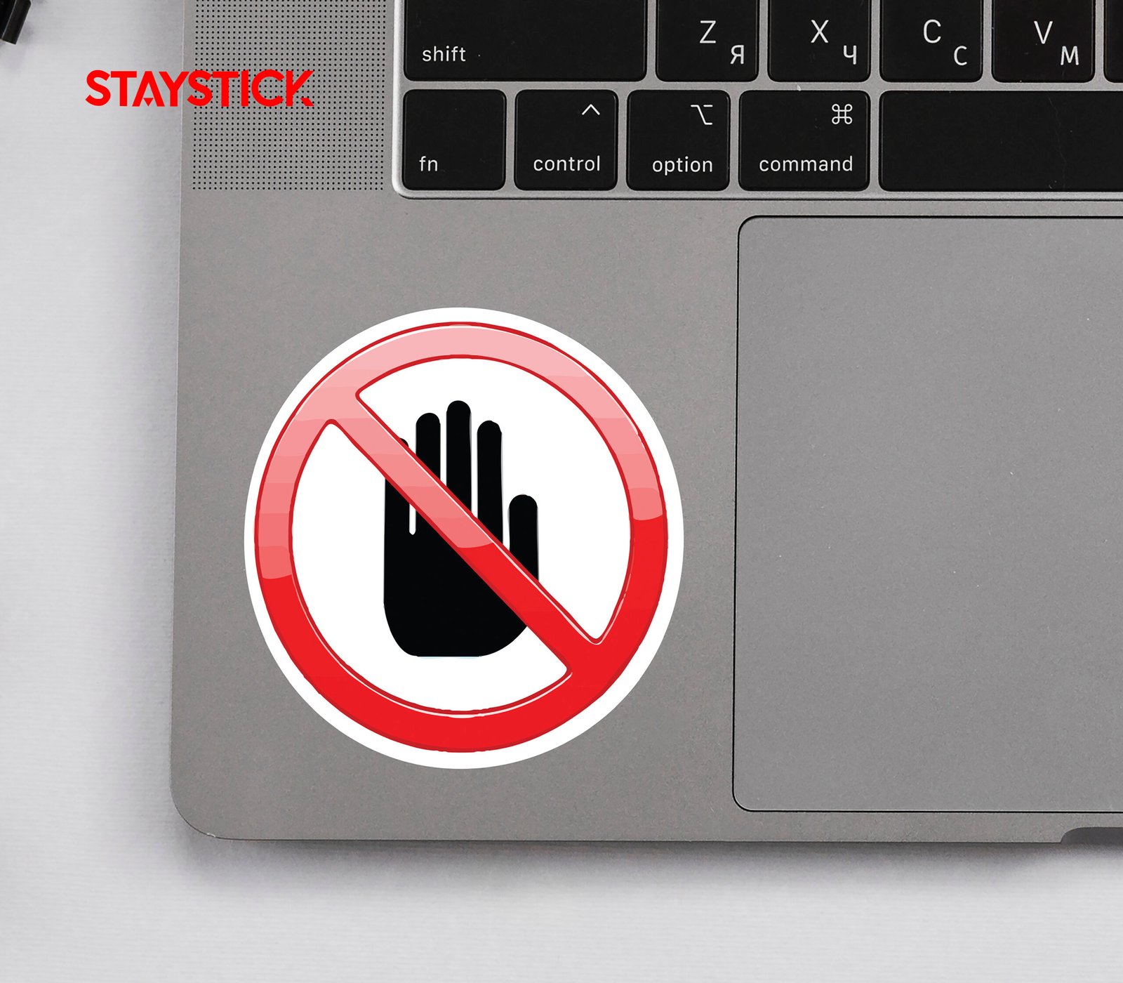 “Red circle with a diagonal line crossing a raised hand symbol.Prohibition sticker indicating no entry or restricted access.Warning sign showing hand stop gesture with a ban symbol.”