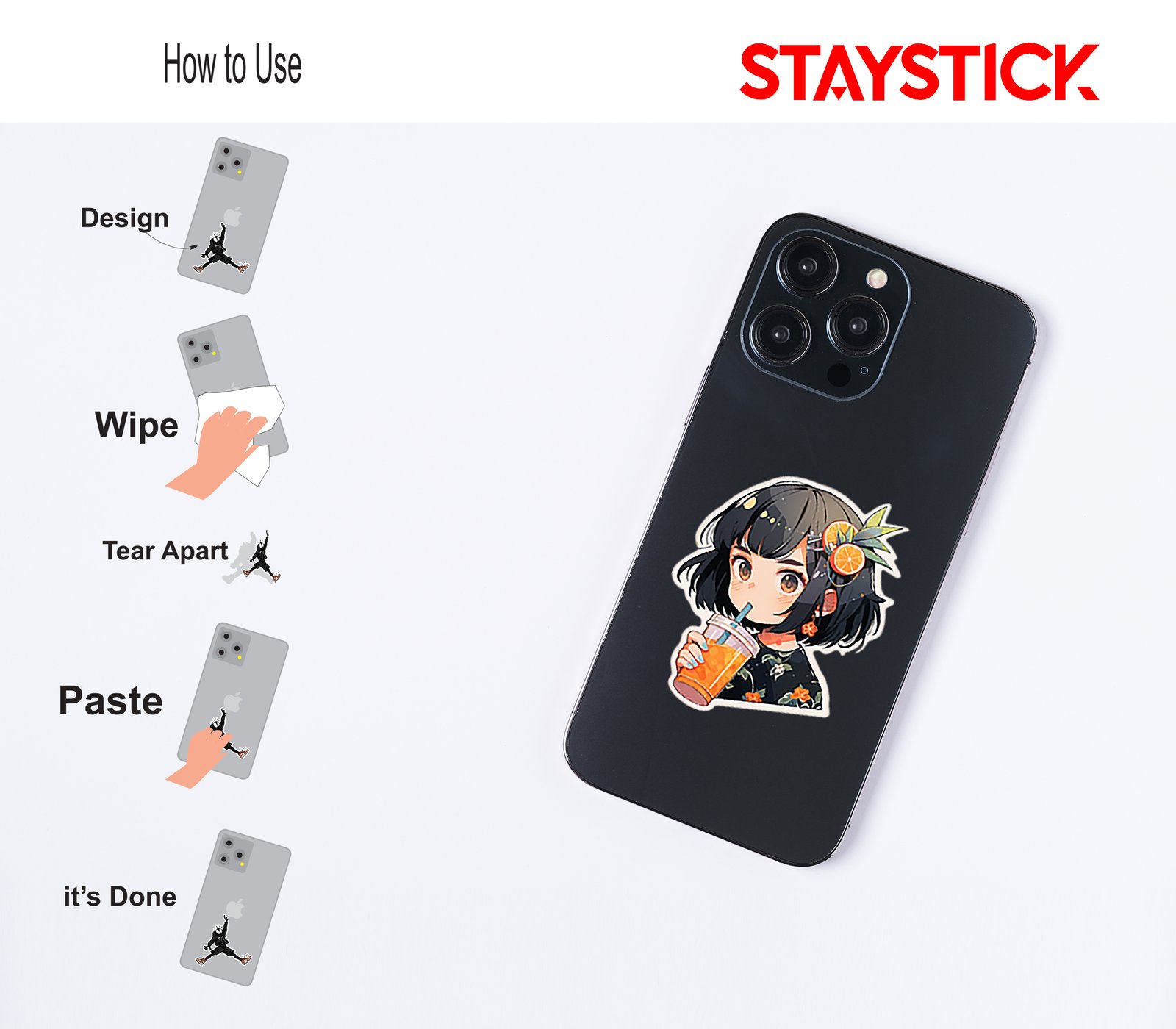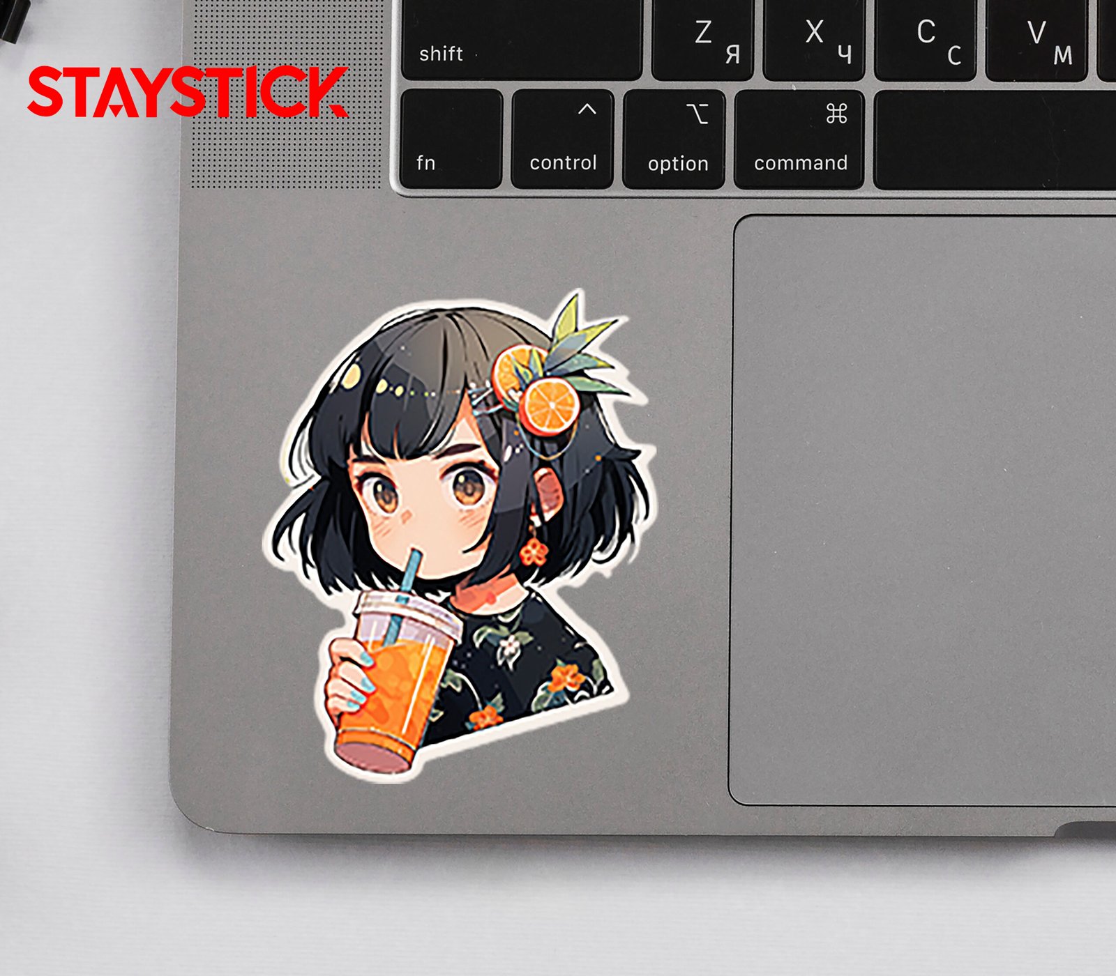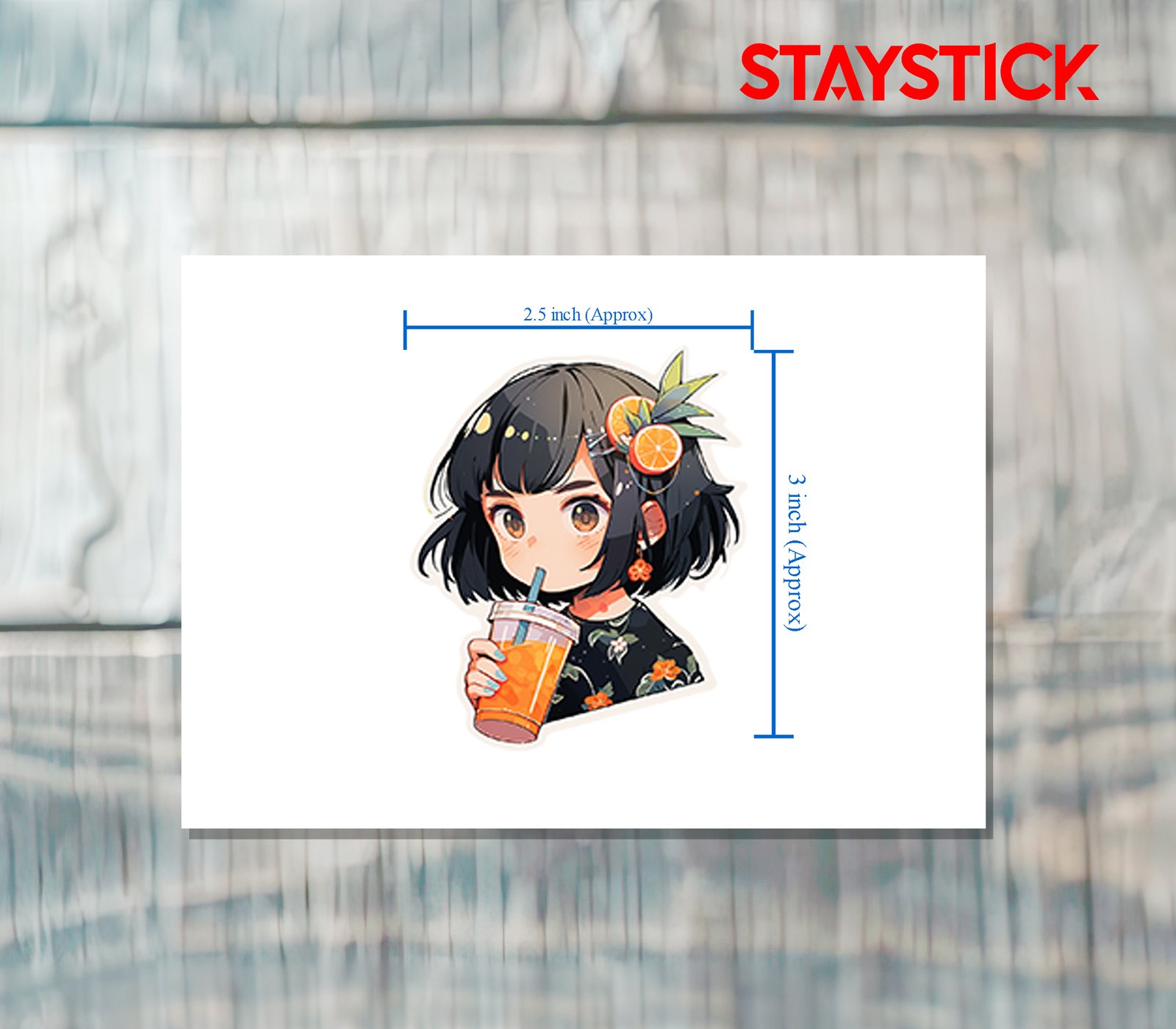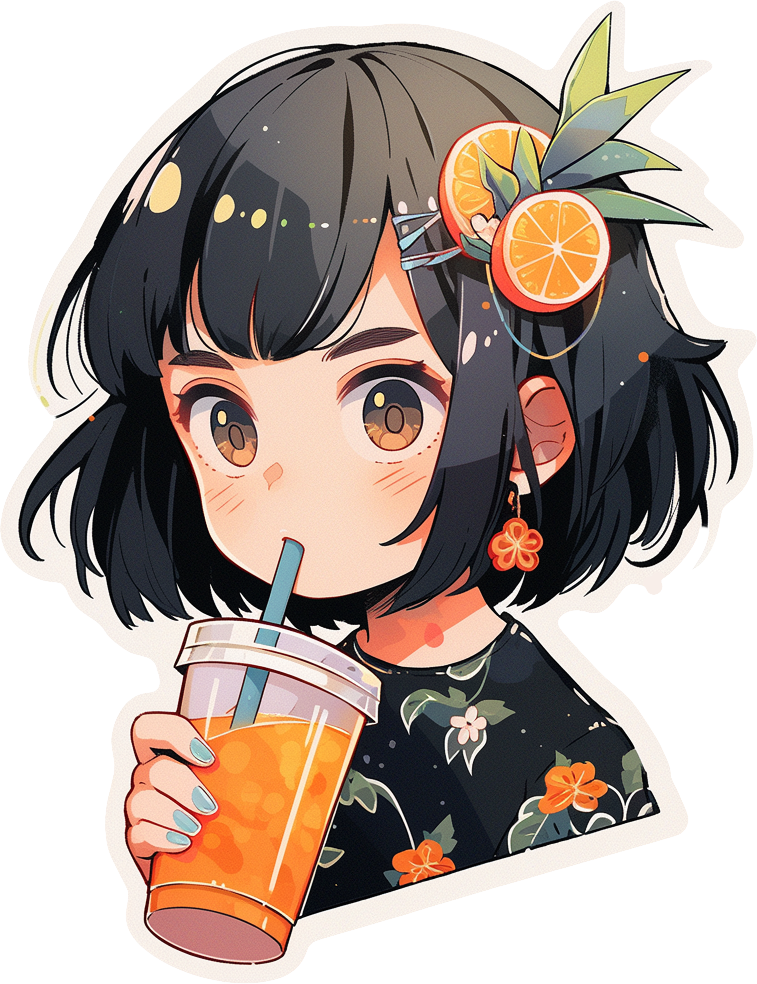 This vibrant sticker showcases a charming anime girl with short black hair, styled with a playful hair clip adorned with fresh orange slices and green leaves. She holds a refreshing cup of orange juice with a straw, perfectly matching her tropical, citrus-inspired look. Dressed in a floral-patterned outfit, with orange blossom earrings adding a sweet touch, her design radiates a cheerful and refreshing vibe. Bright colors and detailed accents bring out a fun summer aesthetic, making this sticker a perfect choice for decorating notebooks, water bottles, or tech accessories with a splash of fruity charm and anime cuteness.