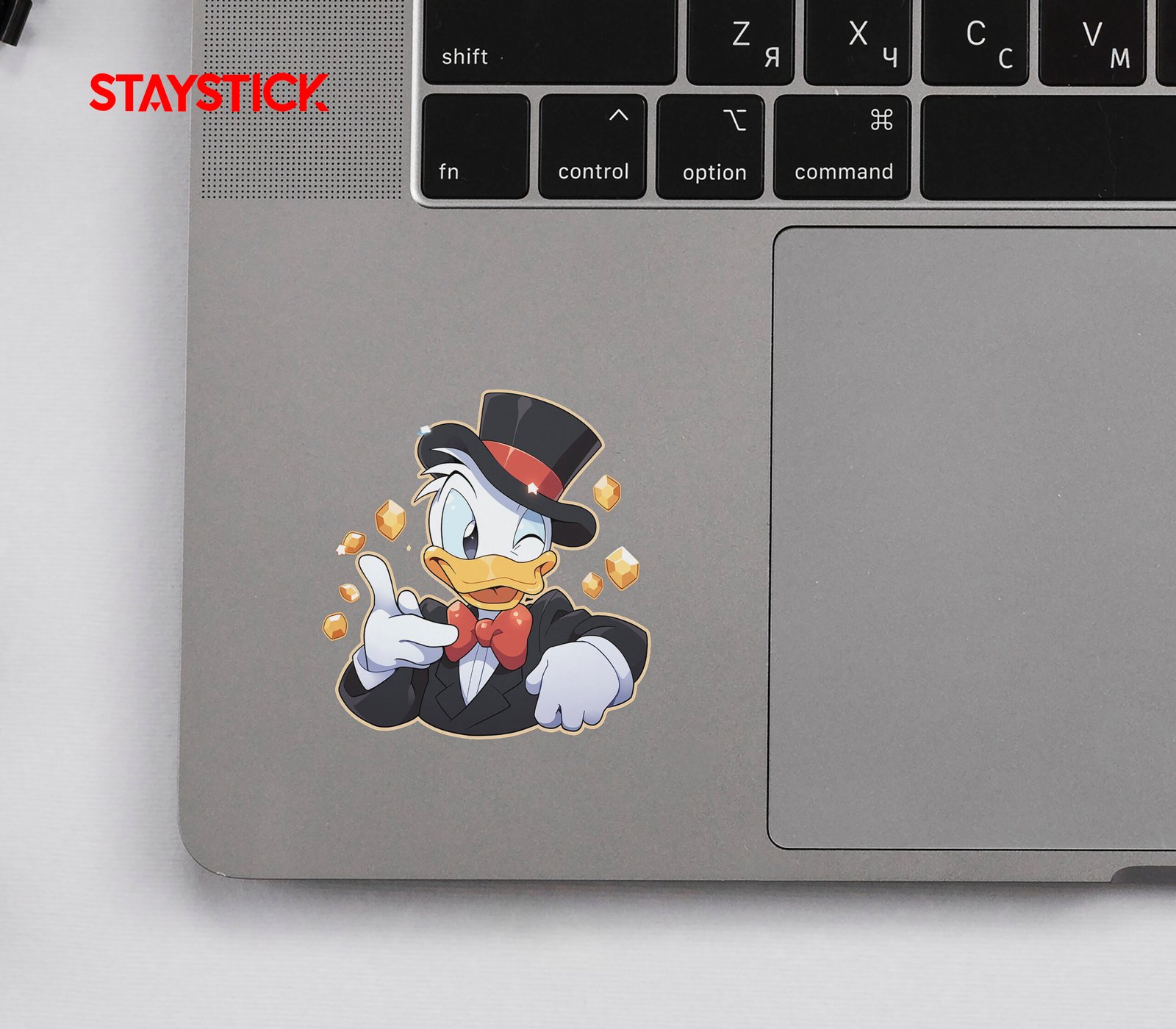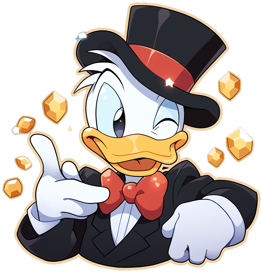 Charming mascot-style illustration showing a confident duck in formal attire, rendered with clean lines, warm highlights, and expressive eyes. Floating gold tokens and star sparkles add a whimsical, treasure-themed vibe ideal for branding, badges, or laptop decals.