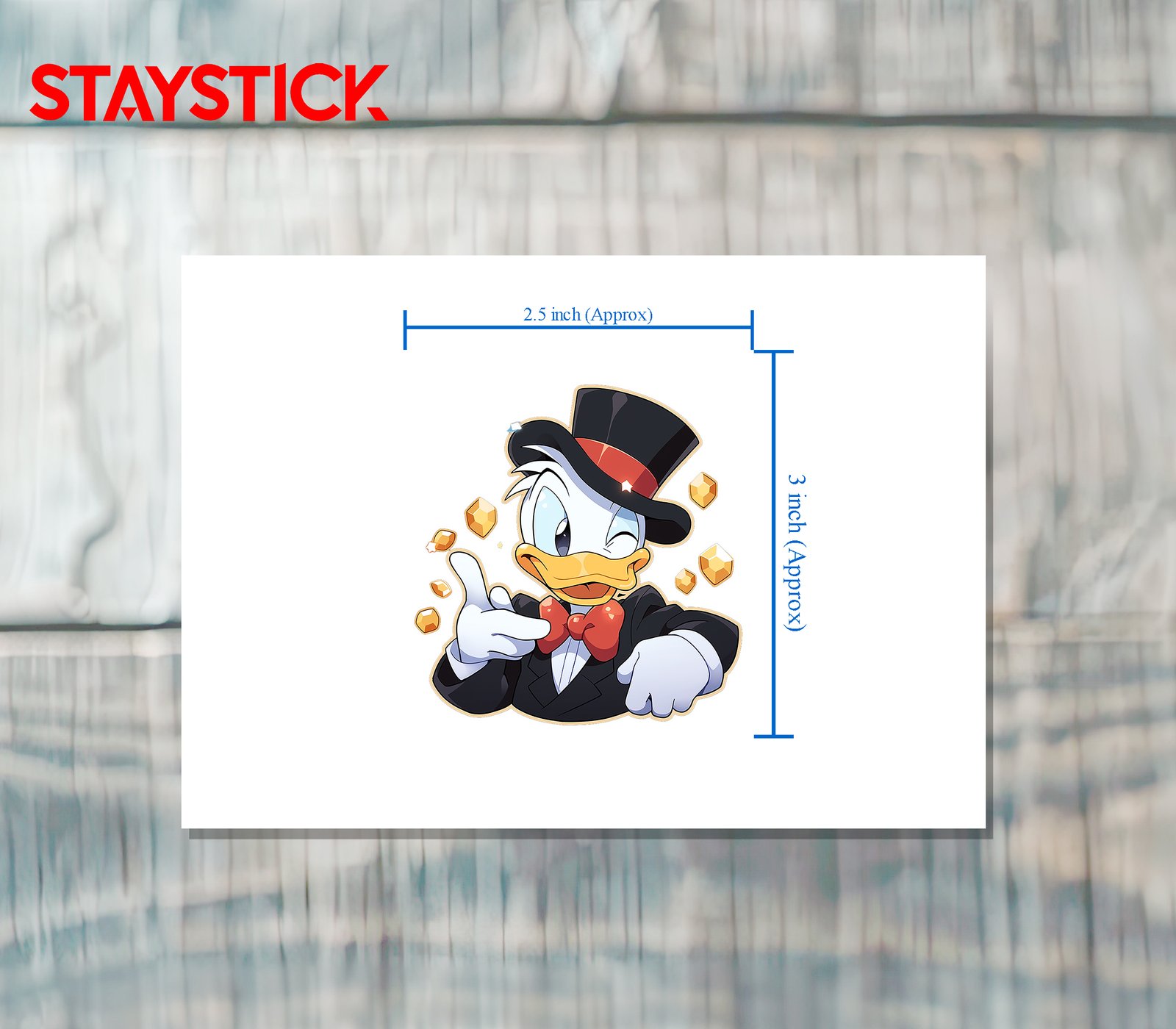 A vibrant, playful sticker of a white duck dressed as a dapper gentleman — black tuxedo, red bow tie, and a sleek top hat — winking and pointing forward while golden gem-like sparkles orbit around him. Thick white die-cut border and glossy shading give it sticker-ready charm.