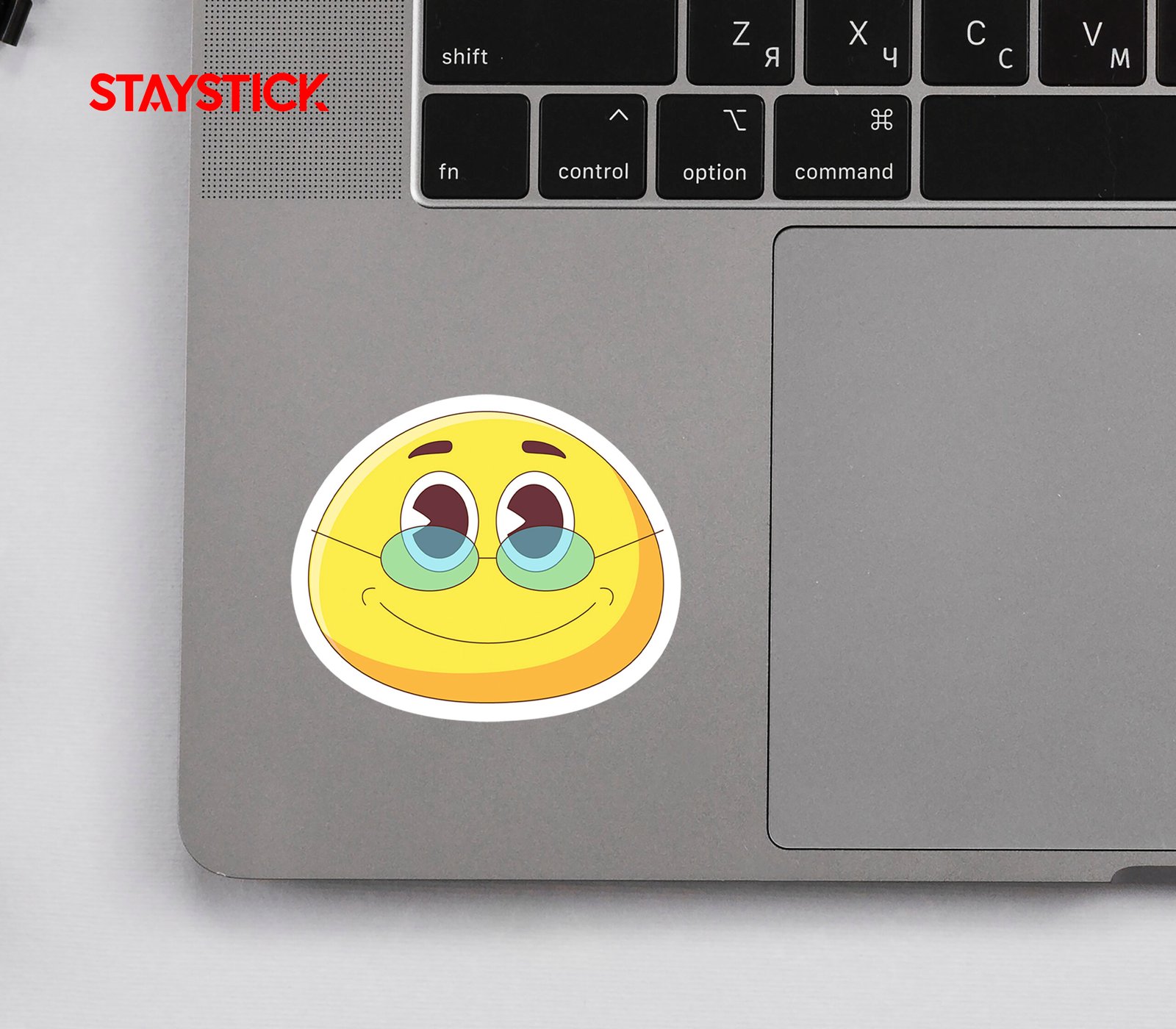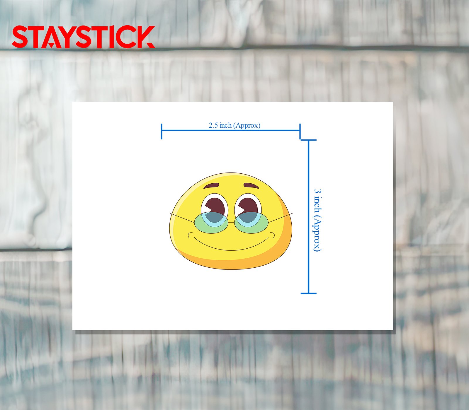 A warm yellow round sticker featuring a gentle smile and small arched brows, wearing mint-blue round sunglasses that give a calm, confident vibe—great for relaxed, positive replies.