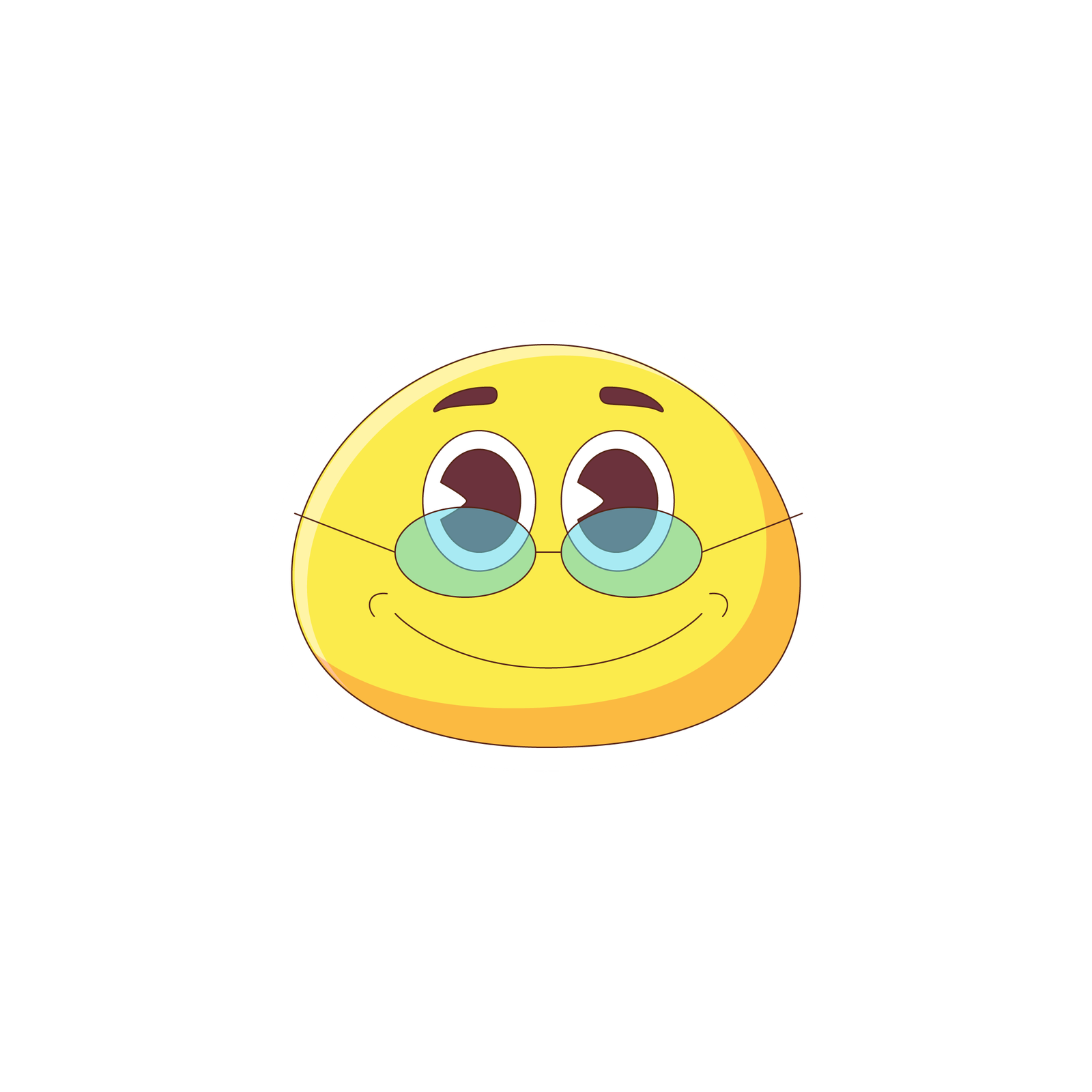 Softly shaded yellow blob with an understated grin and reflective highlights; the tinted lenses reveal sparkling eyes behind them, suggesting friendly coolness.