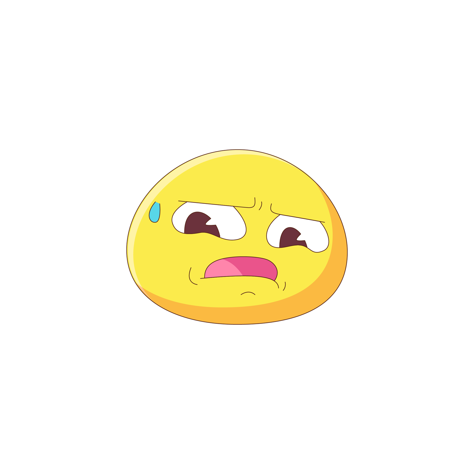 Nervous yellow sticker with a worried frown. Uneasy emoji sweating and grimacing. Anxious face with raised brows and pursed lips. Cute worried blob with a single sweat drop.