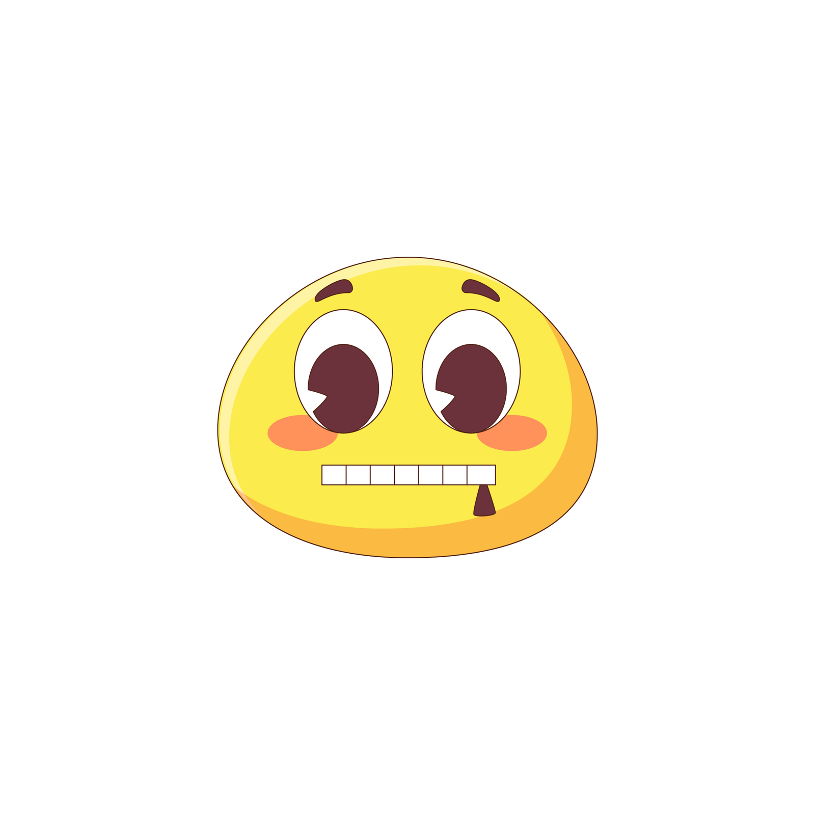 Nervous grin sticker with clenched teeth. Anxious yellow emoticon with blushing cheeks. Awkward smile and droplet of sweat. Timid, worried emoji with big round eyes.