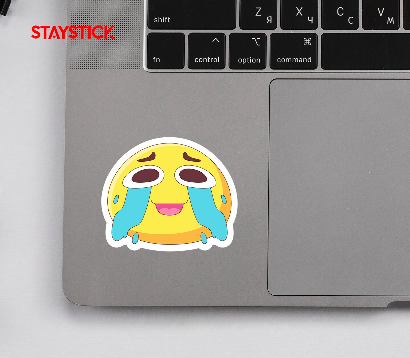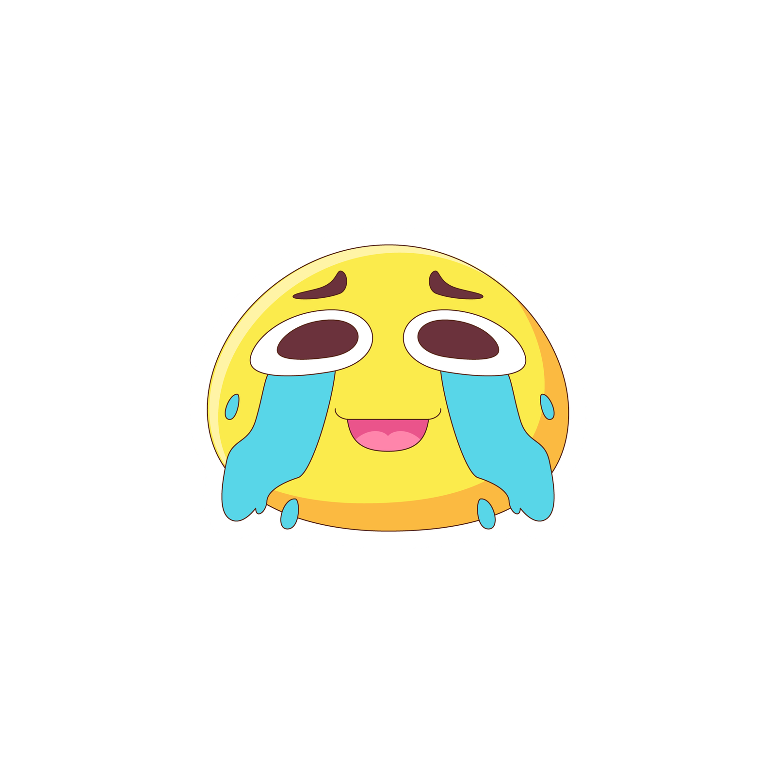 Joyful crying sticker with big teardrops. Smiling emoji overwhelmed with happy tears. Cute yellow face sobbing with delight. Playful teary-eyed emoticon, rosy mouth.