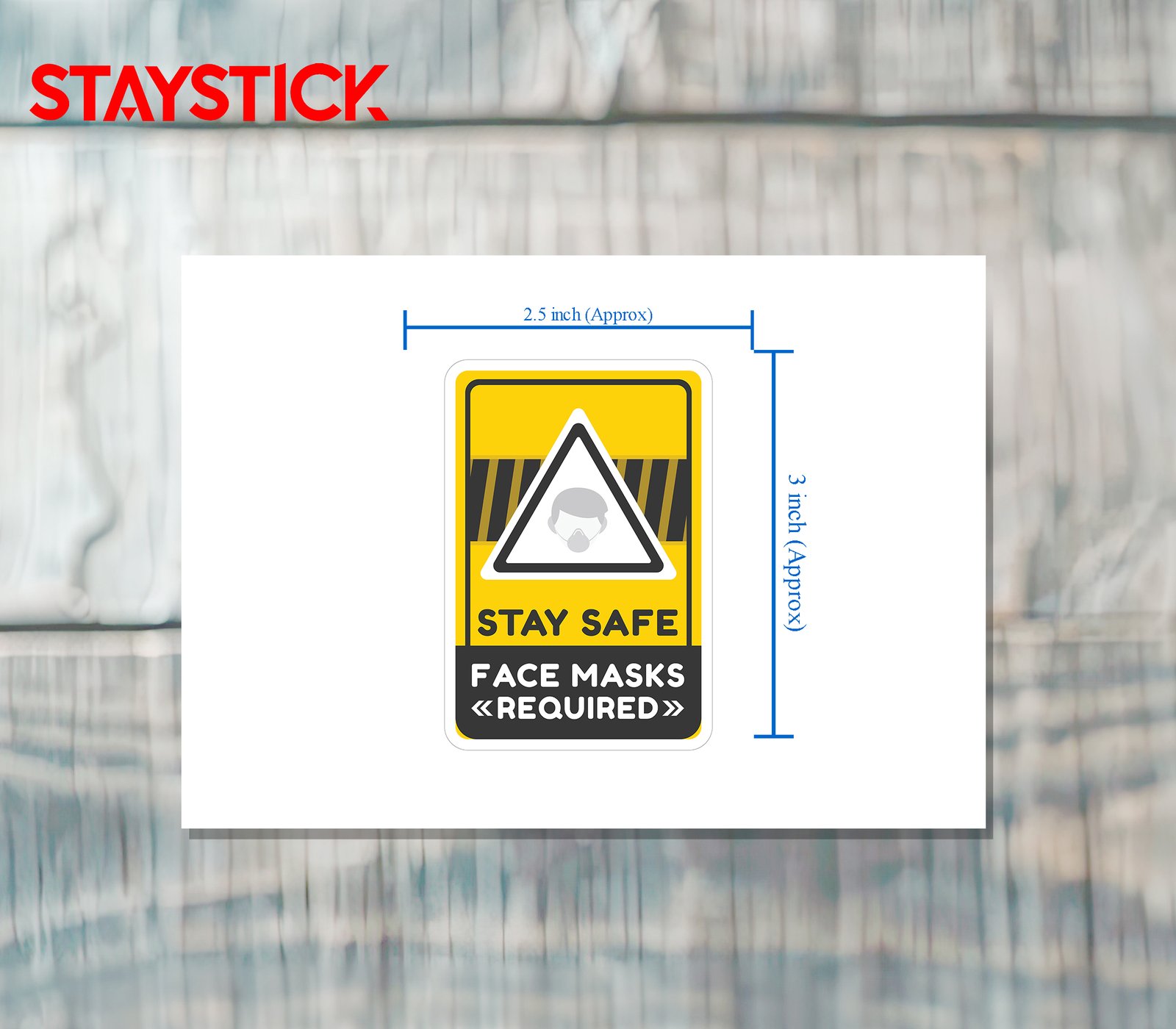 “This sticker features a bold blue and white design with an illustration of a protective face mask in the center. Below the image, the text ‘FACE MASKS REQUIRED’ is clearly displayed, emphasizing the importance of wearing a mask. It serves as a safety reminder for workplaces, shops, hospitals, and other public areas to ensure compliance with health and safety regulations.A clear and professional safety sticker that communicates the requirement of wearing face masks. Designed with a blue background and a simple mask illustration, it attracts attention and provides an easy-to-understand reminder for customers, employees, and visitors to follow health guidelines.”